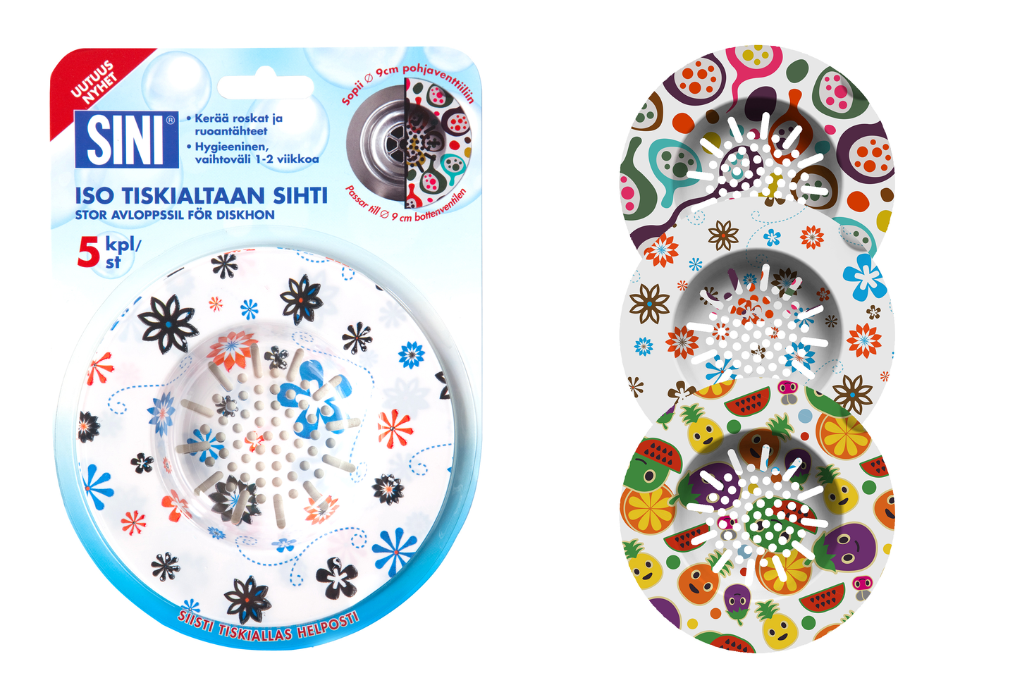 Tiskialtaan sihti auttaa pitämään pesualtaan venttiilin puhtaana ja viemärin vetävänä! Sopii Ø 9 cm pohjaventtiiliin. Sihti kerää roskat ja ruoantähteet. Se on hygieeninen, helppo käyttää ja vaihtaa. Lavuaarin pohjaventtiiliin kertyy helposti jätettä, jonka puhdistaminen on epämiellyttävää. Pesualtaan sihti on kätevä apuväline, joka auttaa pitämään venttiilin puhtaana ja viemärin vetävänä. Sen puhdistus sujuu hygieenisesti likaan koskematta. Sihti on niin ohut, että pesuvesi huuhtoutuu sen sisään esteittä. Leveä reunus kerää jätettä ja estää sen putoamisen viemärinaukkoon. Sihti kiinnittyy itsestään märkää pesuallasta vasten ja pysyy lujasti kiinni. Sihdin vaihtaminen on helppoa sen reunassa olevan sormikolon ansiosta. Pakkauksessa on viisi sihtiä.