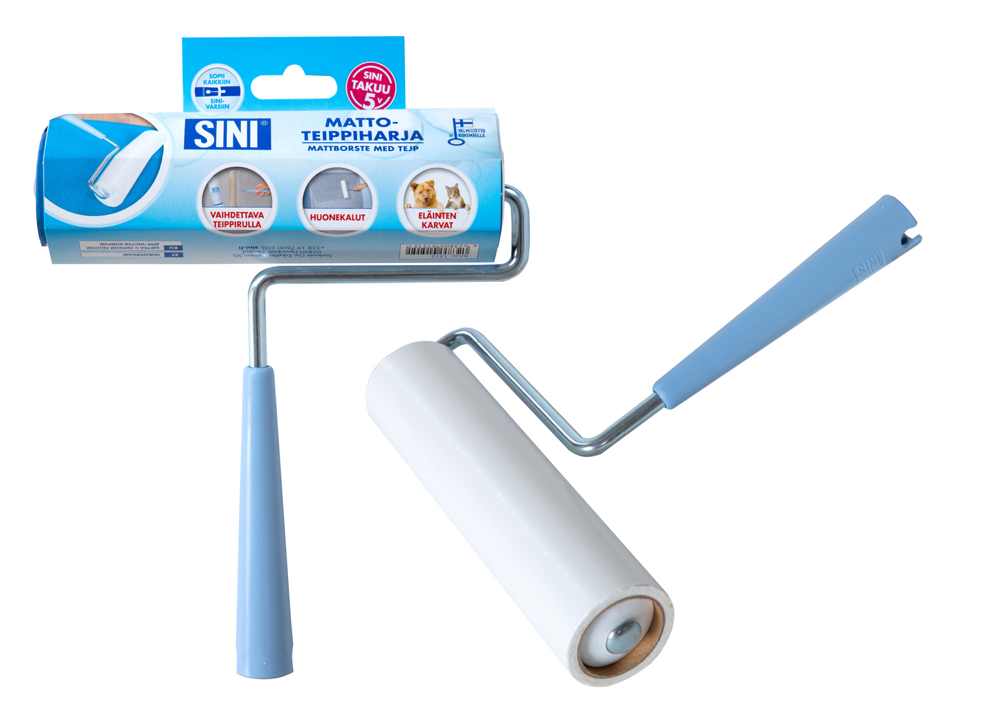 SINI-mattoteippiharja on leveä tarrarulla, jolla puhdistat kätevästi eläinten karvat sekä pienet roskat, hiukset ja pölyt matoilta ja huonekaluista. Mattoteippiharjan 20 cm leveässä telamaisessa rullassa on 10 metriä teippiä ja valmiit viillokset, joiden kohdalta käytetyn teipin saa repäistyä pois. Mattoteippiharjan saa yhdistettyä kaikkiin SINI-välinevarsiin, jolloin mattojen puhdistus sujuu kumartelematta.