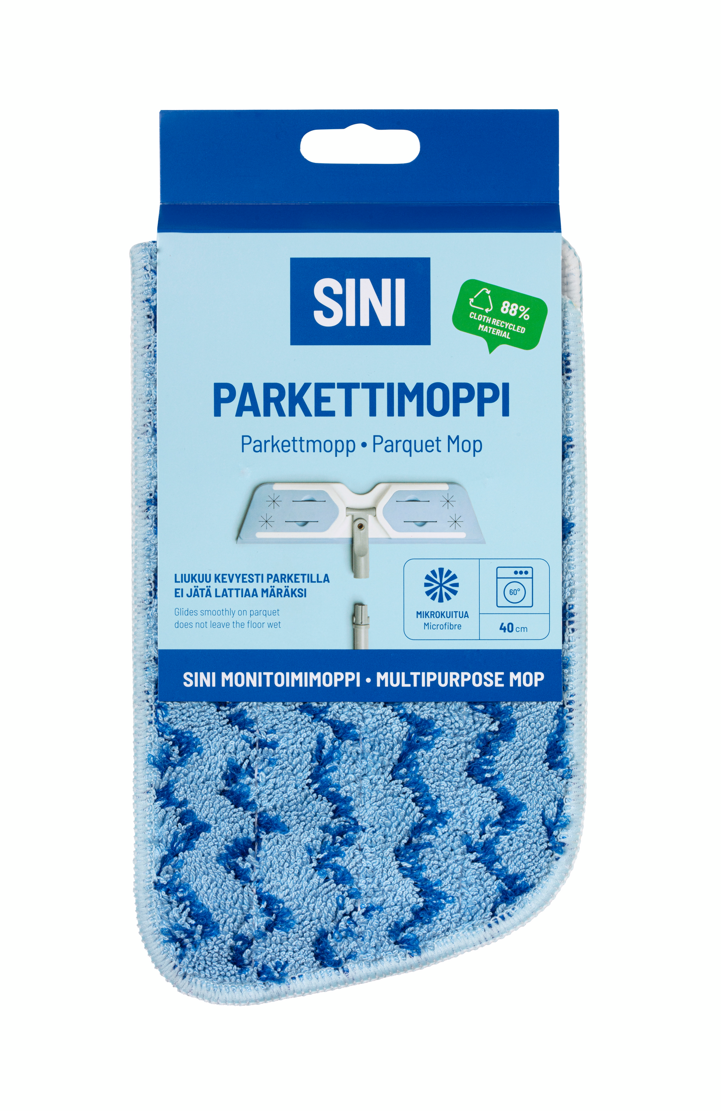 Parkettimoppi kestää kymmeniä pesukertoja 60 asteessa pesukoneessa.