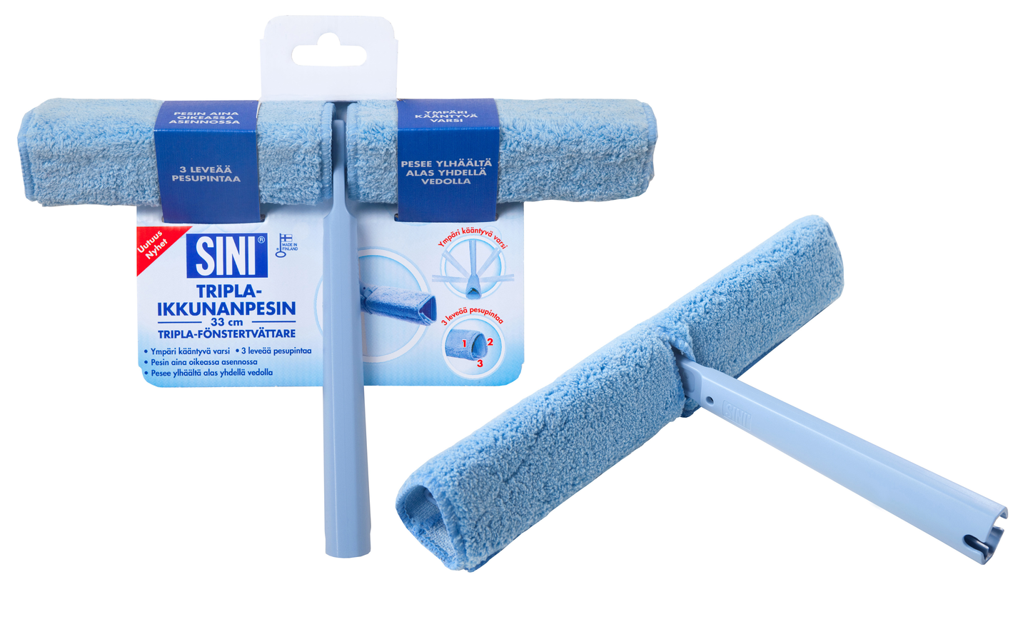 Tripla-ikkunanpesin kääntyy lähes 360 astetta, jolloin se on aina oikeassa kulmassa pestävää ikkunapintaa vasten. Tripla-ikkunanpesimellä kaikenkokoisten ikkunoiden pesu sujuu vaivatta. Kolmionmallisen ikkunanpesimen kolme pesupintaa tehostavat Iyöskentelyä. Mikrokuituikkunanpesimellä saa säihkyvän puhdasta jälkeä jopa pelkällä vedellä. Mikrokuituinen päällinen kiinnitetään ikkunanpesimen runkoon tarranauhojen avulla. Ikkunapesin sopii kaikkiin Sini-välinevarsiin. Myydään myös Tripla-pesinsettinä kuivaimen ja ikkunaliinan kanssa. Tripla ikkunapesin Suomessa valmistettu Avainlipputuote.
