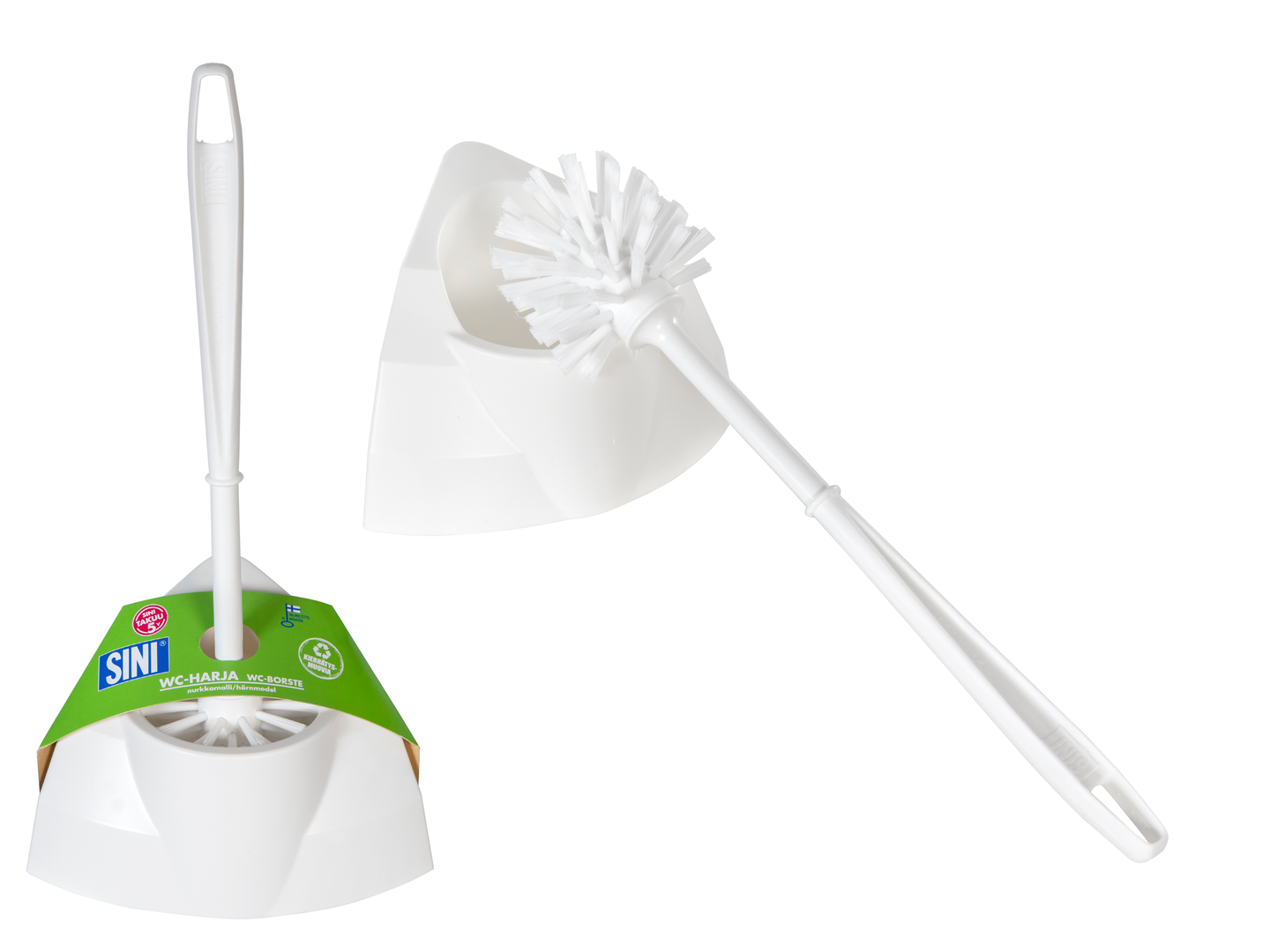 Nurkkamallinen wc-harja vie vain vähän tilaa, sillä kolmiomainen kuppiosa painuu seinän viereen aivan nurkkaan asti.