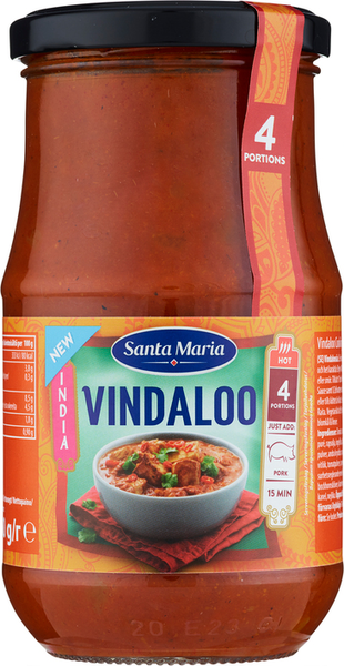 Santa Maria Vindaloo Cookng Sauce on mausteinen valmiskastike, jonka avulla valmistat helposti ja nopeasti herkullisen intialaisen aterian ystävillesi ja perheellesi. Vindaloo on tomaattipohjainen curry, jossa on voimakkaita mausteneilikan, inkiväärin, kanelin ja chilin aromeja. Käytä Santa Maria Vindaloo -kastiketta kanan, lampaan tai kasvisvaihtoehtojen kanssa. • Valmista helposti herkullisen mausteista Vindaloota • Sisältää pohjan noin neljälle annokselle Vindaloota