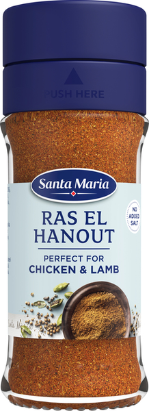Ras El Hanout on perinteinen marokkolainen mauste lammas-, kana- ja vihannesmuhennoksille. Santa Maria Ras El Hanout on mieto sekoitus, jossa on runsaasti korianterin, kardemumman ja muskottipähkinän makuja. Ras El Hanout on täydellinen mauste muhennoksille, keitoille ja grilliruoalle. Santa Maria Moroccan Ras El Hanout on myös erinomainen mauste hummukselle, falafelille ja muille kikherneistä tai pavuista valmistetuille ruoille. • Säilytä kuivassa ja pimeässä aromin säilyttämiseksi pidempään