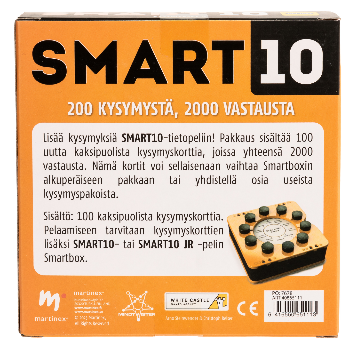Lisää kysymyksiä SMART10-tietopeliin! Pakkaus sisältää 100 uutta kaksipuolista kysymyskorttia, joissa yhteensä 2000 vastausta. Nämä kortit voi sellaisenaan vaihtaa Smartboxin alkuperäiseen pakkaan tai yhdistellä osia useista kysymyspakoista. Sisältö: 100 kaksipuolista kysymyskorttia. Pelaamiseen tarvitaan kysymyskorttien lisäksi SMART10- tai SMART10 JR -pelin Smartbox. 2-8 pelaajaa, 20 min, 14+.