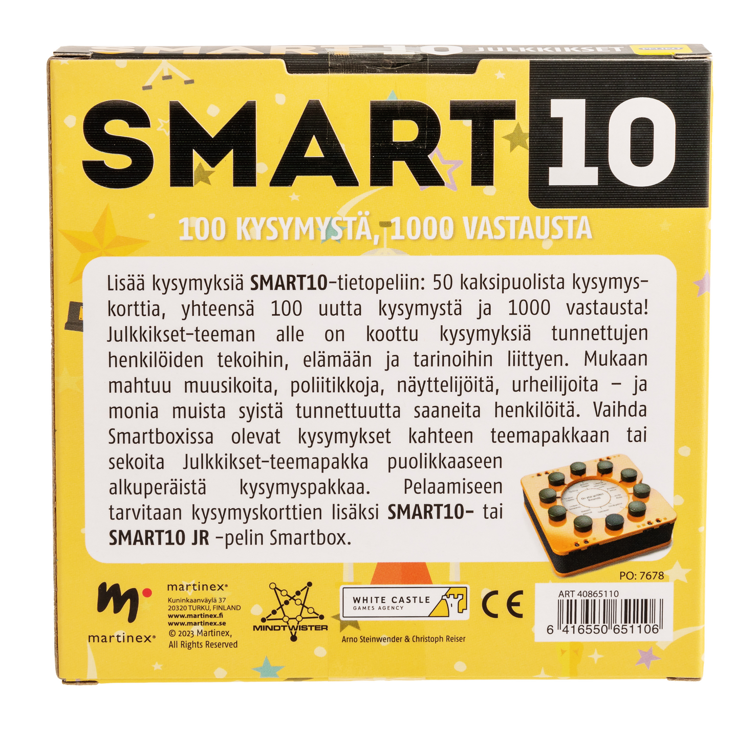 Lisää kysymyksiä SMART10-tietopeliin: 50 kaksipuolista kysymyskorttia, yhteensä 100 uutta kysymystä ja 1000 vastausta! Julkkikset-teeman alle on koottu kysymyksiä tunnettujen henkilöiden tekoihin, elämään ja tarinoihin liittyen. Mukaan mahtuu muusikoita, poliitikkoja, näyttelijöitä, urheilijoita – ja monia muista syistä tunnettuutta saaneita henkilöitä. Vaihda Smartboxissa olevat kysymykset kahteen teemapakkaan tai sekoita Julkkikset-teemapakka puolikkaaseen alkuperäistä kysymyspakkaa. Pelaamiseen tarvitaan kysymyskorttien lisäksi SMART10- tai SMART10 JR -pelin Smartbox. 2-8 pelaajaa, 20 min, 14+.