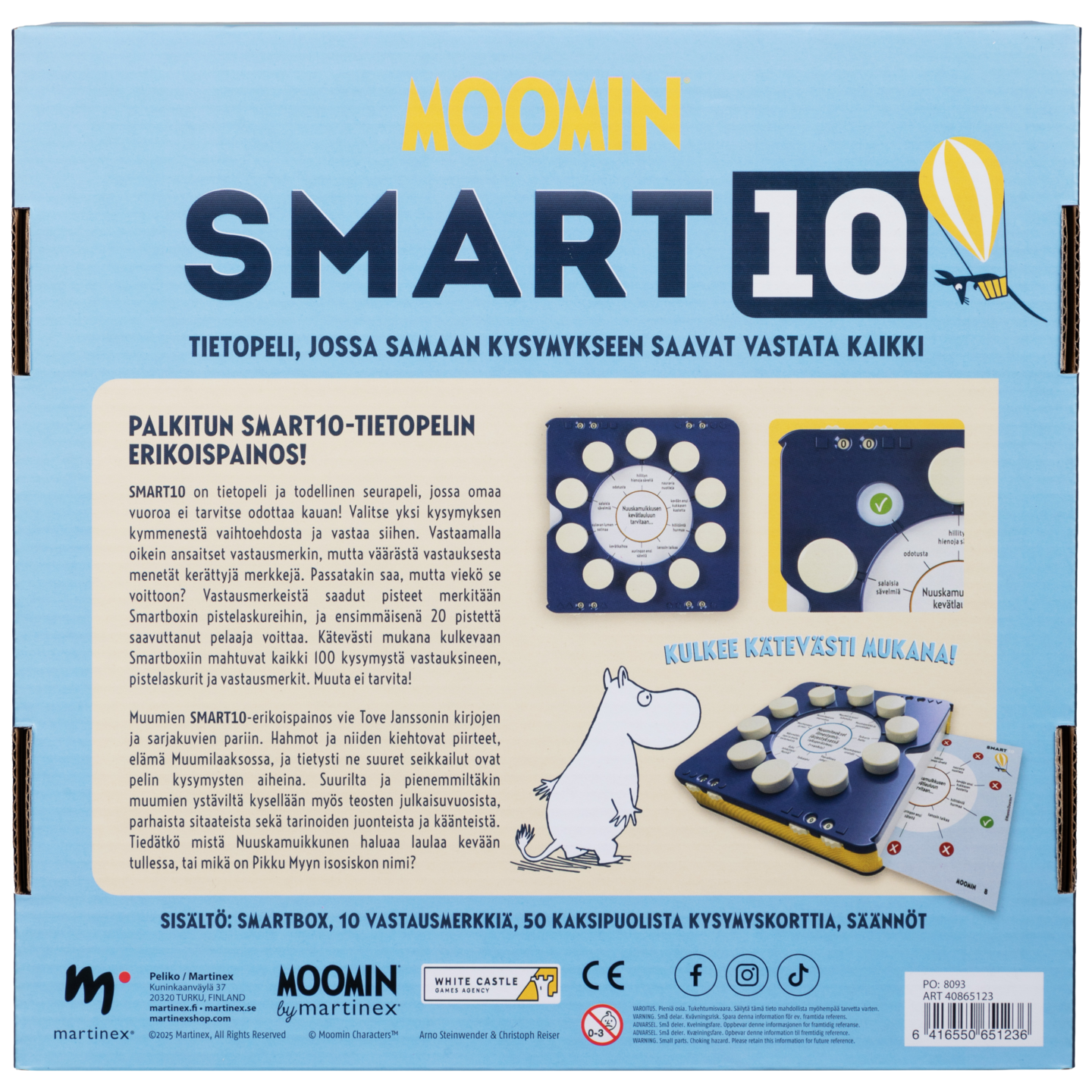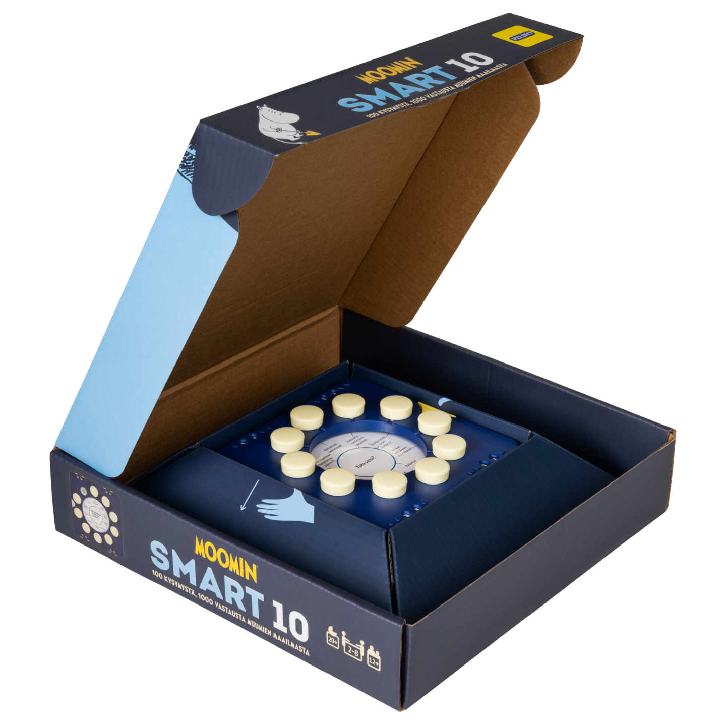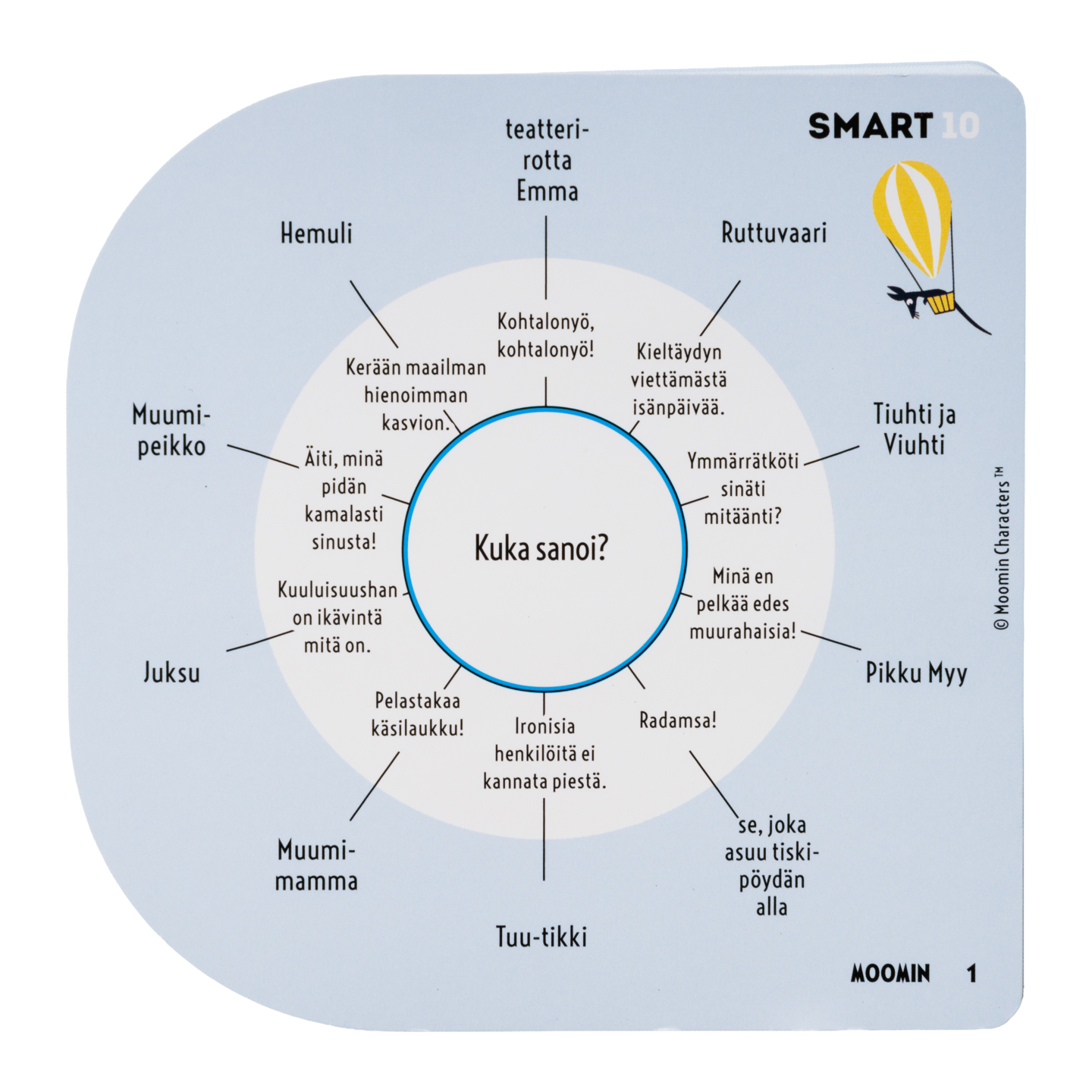 Erikoispainos Smart10-tietopelistä, aihealueena Tove Janssonin luomat, suomalaisten rakastamat Muumit, jotka juhlivat 80-vuotista taivaltaan vuonna 2025. Tuttuun Smart10-tyyliin kaikki pelaajat saavat vuorollaan mahdollisuuden vastata kysymykseen. Jos vastaus on oikea, pelaaja saa vastausmerkin, mutta jos vastaus on väärä, hän menettää kaikki pelikierroksen pisteet. Kannattaako vastata, ottaa riski vai passata? Pisteet merkitään smartboxin pistelaskureihin ja ensimmäisenä 20 pistettä kerännyt pelaaja voittaa! Peli sisältää 50 kaksipuolista korttia, joissa on yhteensä 100 kysymystä ja 1000 vastausta, sekä smartboxin 50 kortille. 2-8 pelaajaa, 20 min, 12+