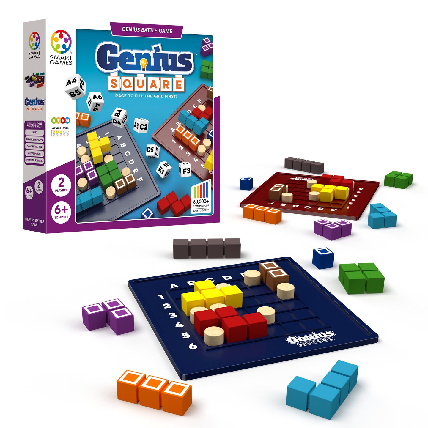 SmartGames Genius Square –peliä voit pelata yksin tai yhdessä kaverin kanssa! Heitä nopat, aseta esteet paikoilleen ja yritä täyttää pelilauta mahdollisimman nopeasti yhdeksällä värikkäällä palikalla. Pelissä on viisi eri vaikeustasoa ja yli 60 000 erilaista haastetta, joihin on ainakin yksi ratkaisu. Testaa nopeuttasi ja hahmotuskykyäsi tässä nerokkaassa pelissä! Sisältö: 2 pelilautaa, 2x9 värikästä palikkaa, 2x7 estettä, 7 noppaa ja pelisäännöt. Pelaa yksin tai yhdessä kaverin kanssa. Ikäsuositus: 6+