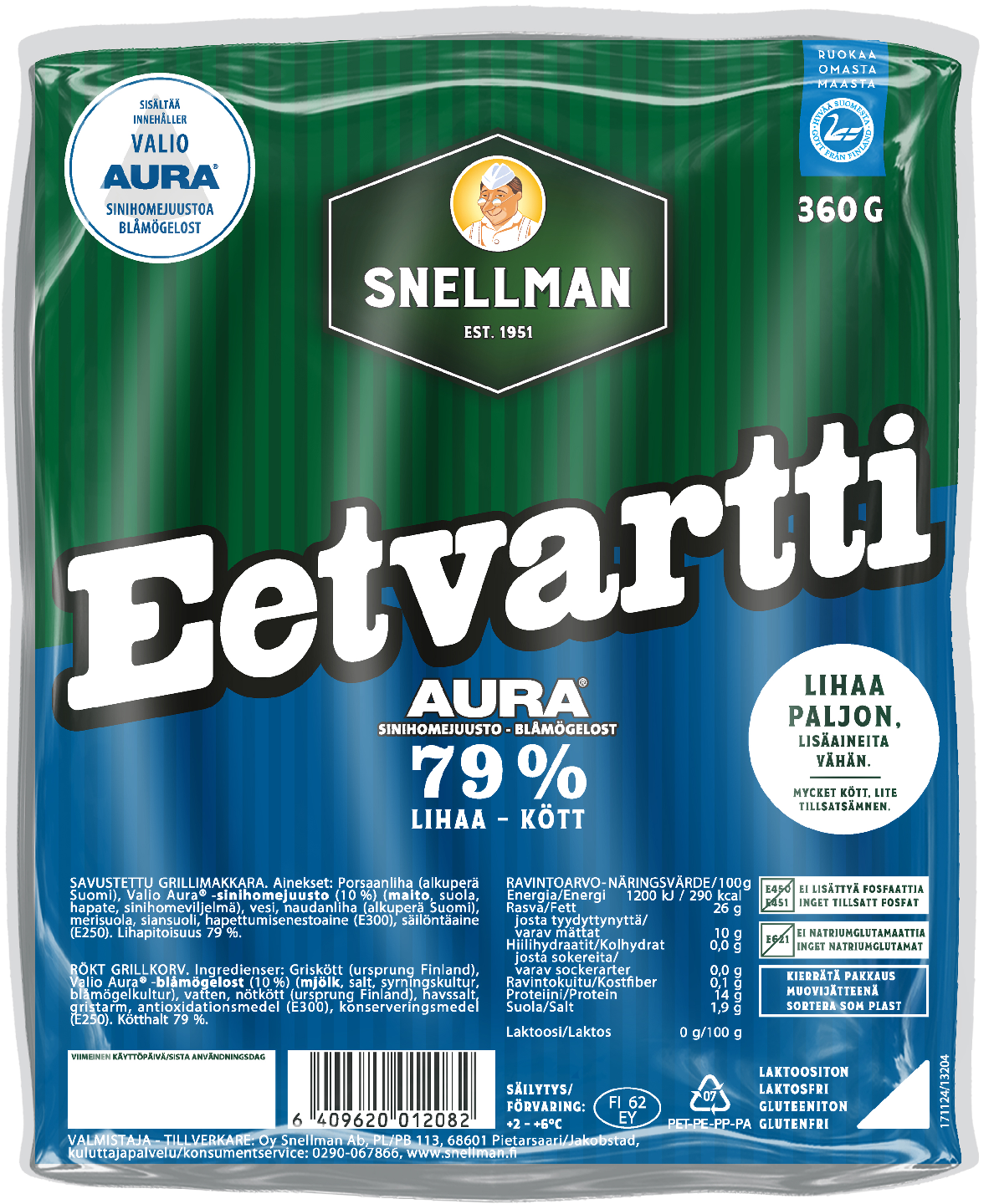 Grillimakkara, jossa Snellmanin laadukasta, kotimaisen lihaisaa klassikkoa värittää vähintään neljä viikkoa kypsytetty hapan ja voimakasarominen sinihomejuusto. Tämä on ehdottomasti grillihyllyn Valioyksilö!
