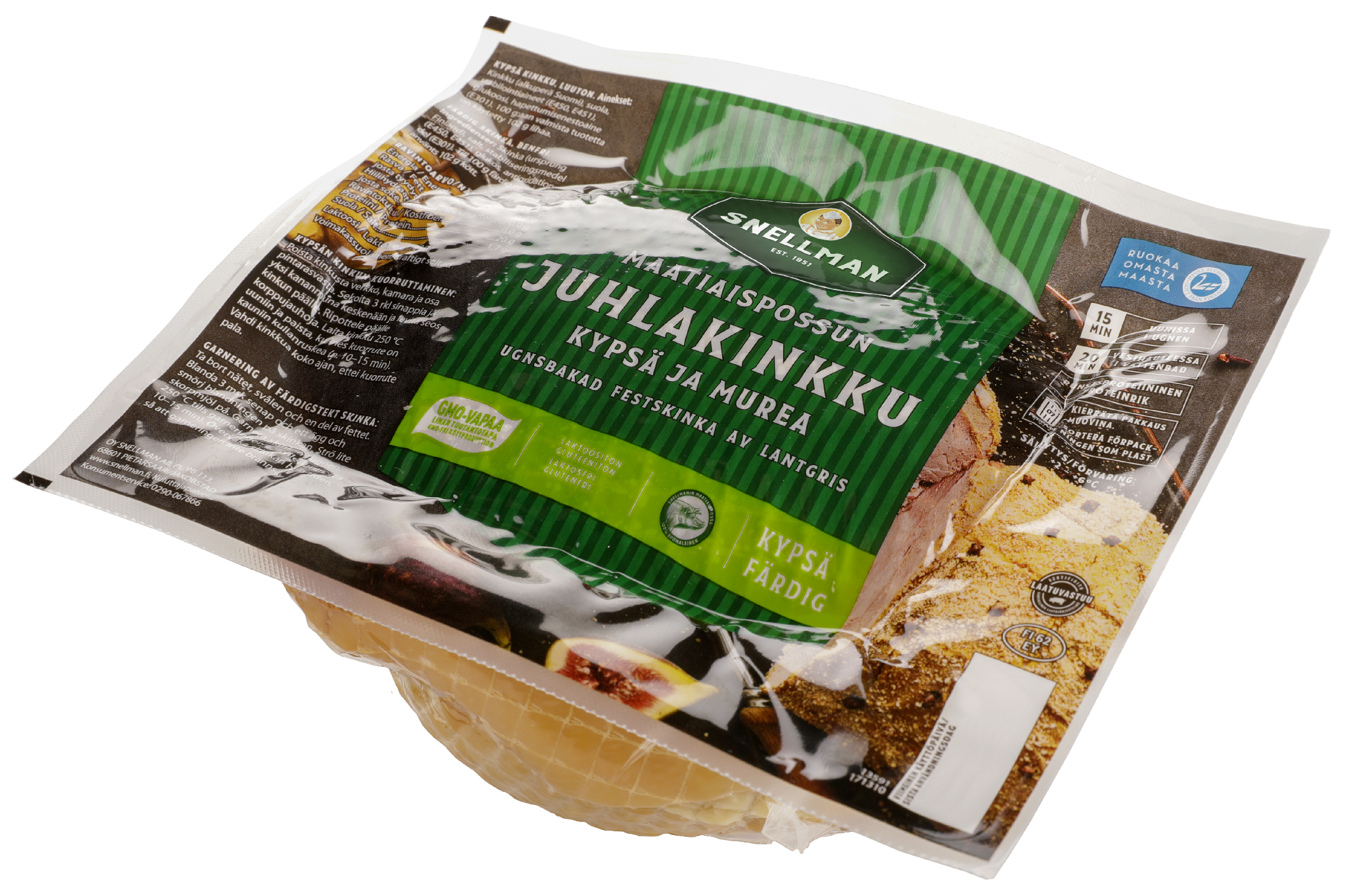 Kypsä juhlakinkku on helppo ja herkullinen vaihtoehto perinteiselle joulukinkulle. Se on valmis syötäväksi sellaisenaan – kylmänä tai lämmitettynä. Valmistettu Pietarsaaressa kotimaisesta GMO-vapaasta lihasta. Yksittäisen tuotteen keskimääräinen paino on 1 300 g.
