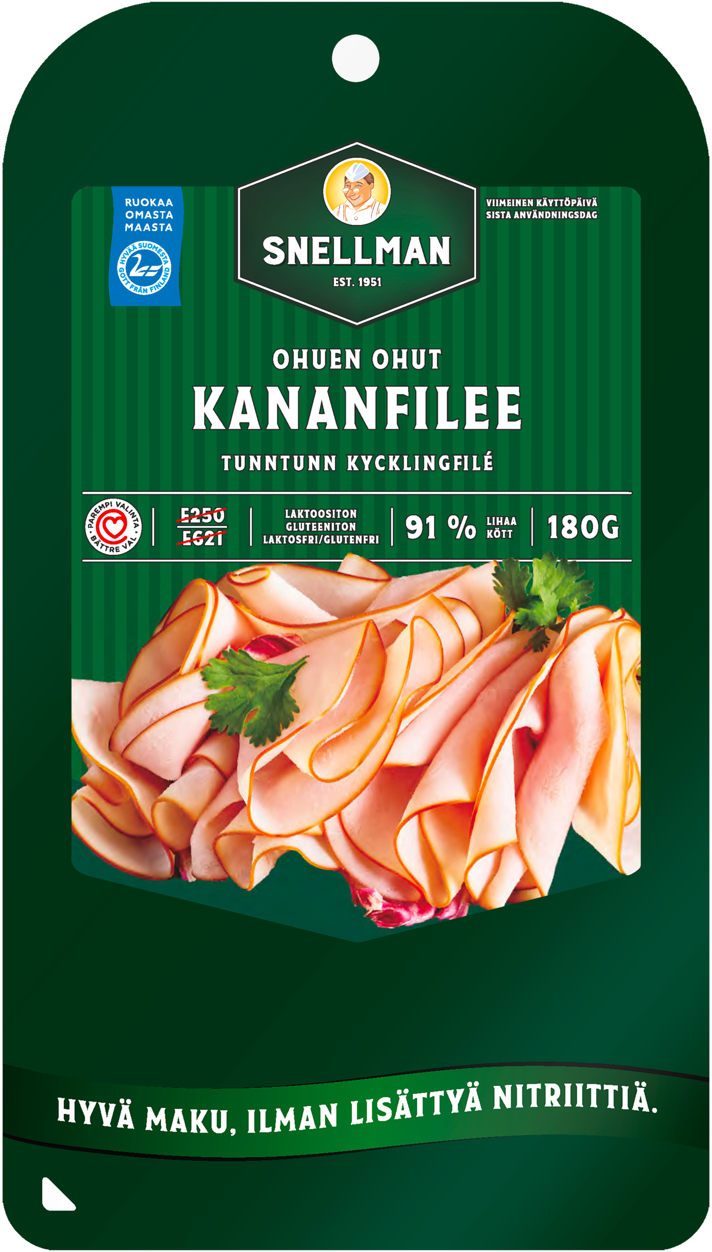Ohuen ohut kananfilee valmistetaan kotimaisesta broilerista aidosti savustamalla. Murea ja mehevä rakenne ja ohuet viipaleet tekevät siitä täydellisen leivälle. Pakkausta komistaa myös Sydänmerkki, eli kananfilee on myös terveyden kannalta parempi valinta. Ja mikä parasta, se valmistetaan kokonaan ilman lisättyä nitriittiä!