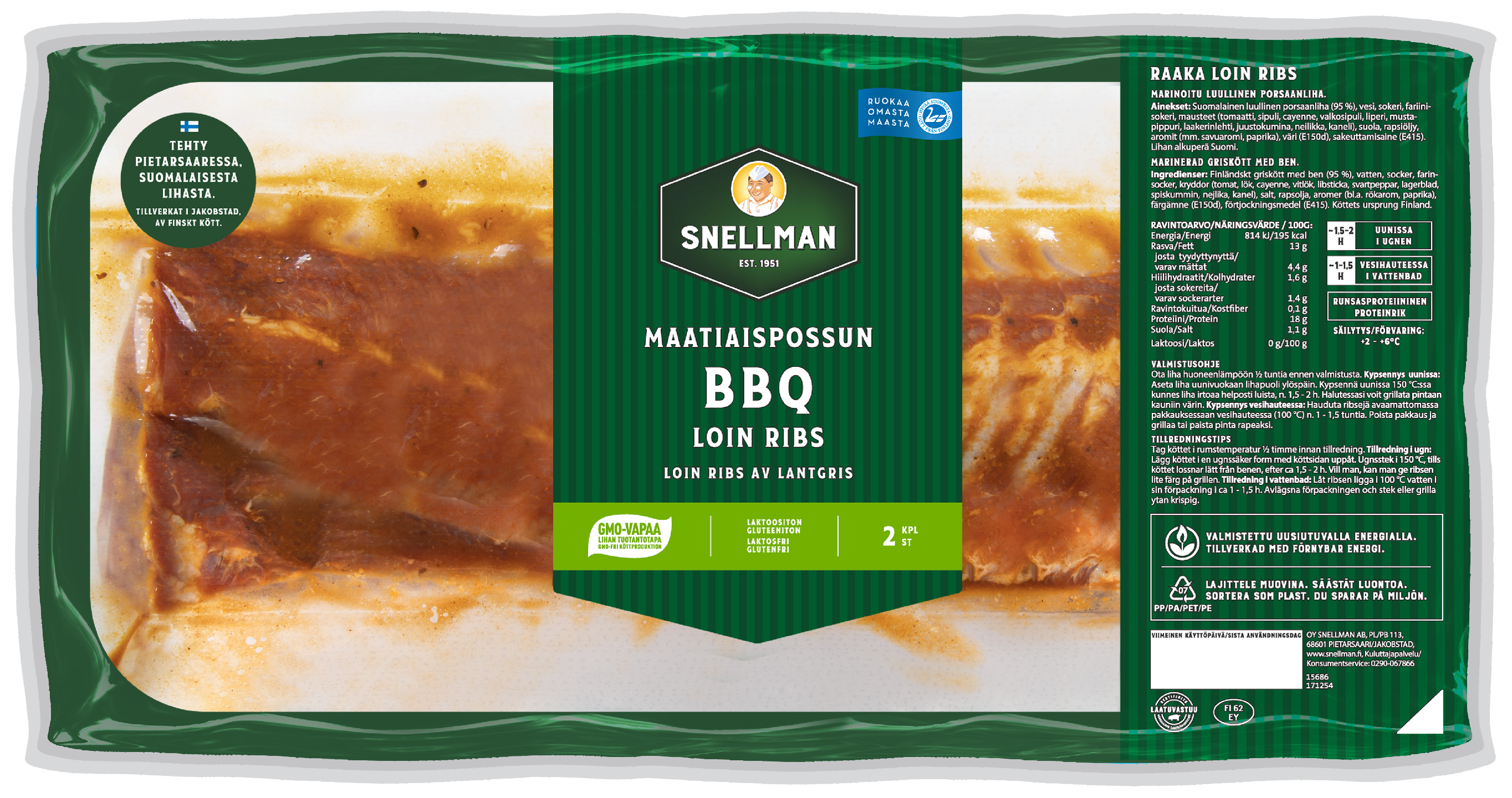 Maatiaispossun loin ribsit leikataan ulkofileen vierestä, jolloin ne valmistuvat nopeammin. BBQ-maustetut mehevät ribsit voi halutessaan esikypsentää pakkauksessaan. Suomalaista, GMO-vapaata maatiaispossua perhetiloilta. Kausituote. Yksittäisen tuotteen keskimääräinen paino on 1 100 g.