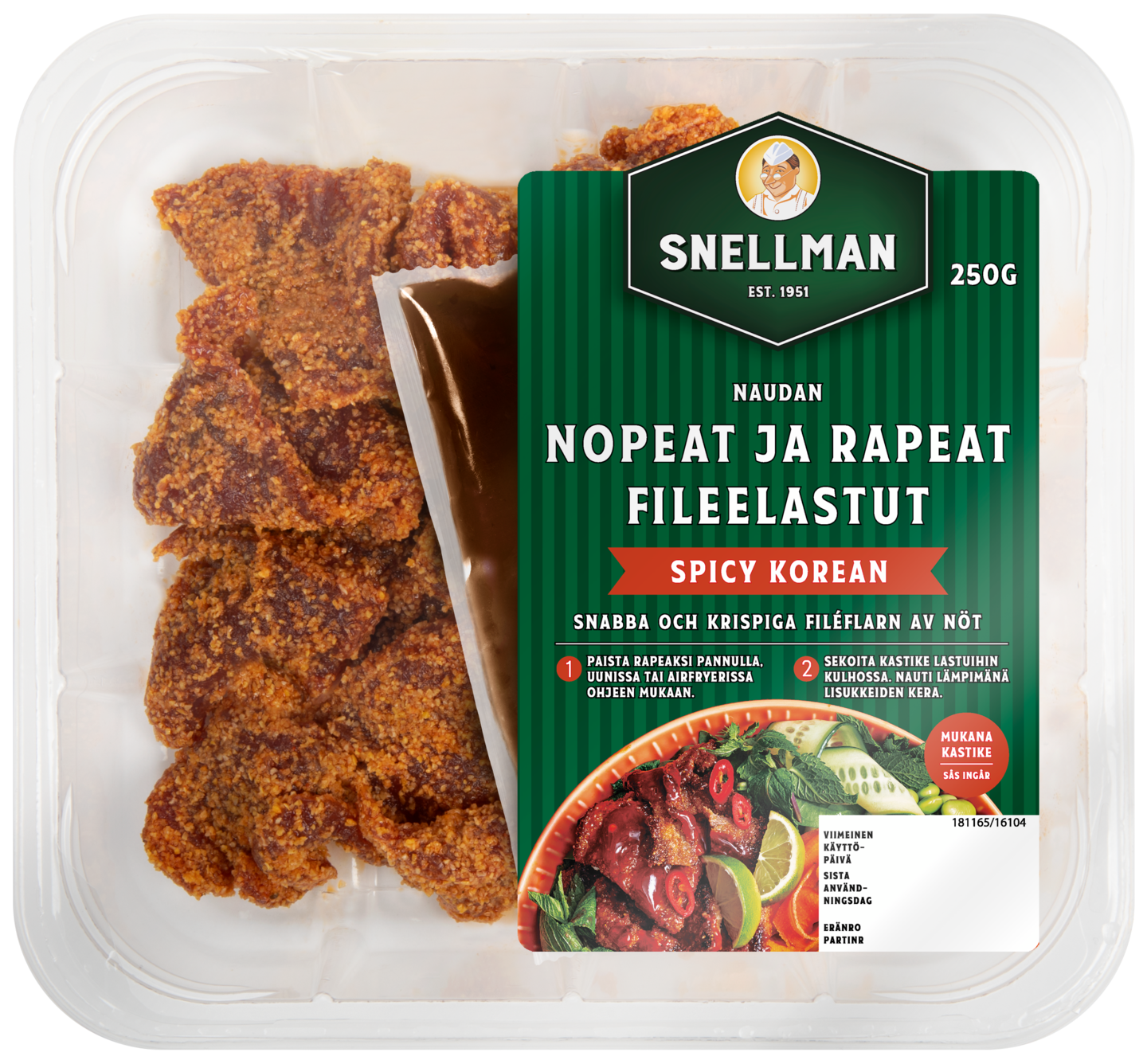Naudan maissipaneroidut rapeat fileelastut ovat nimensä mukaisesti nopeita ja rapeita. Pakkauksen mukana tulee täyteläisen tulinen Spicy korean -kastike, jossa on juuri sopivasti makua ja potkua. Paista lastut rapeaksi pannulla, uunissa tai airfryerissa, sekoita kastike joukkoon ja nauti vaikka nuudeleiden, riisin tai kasvisten kera.