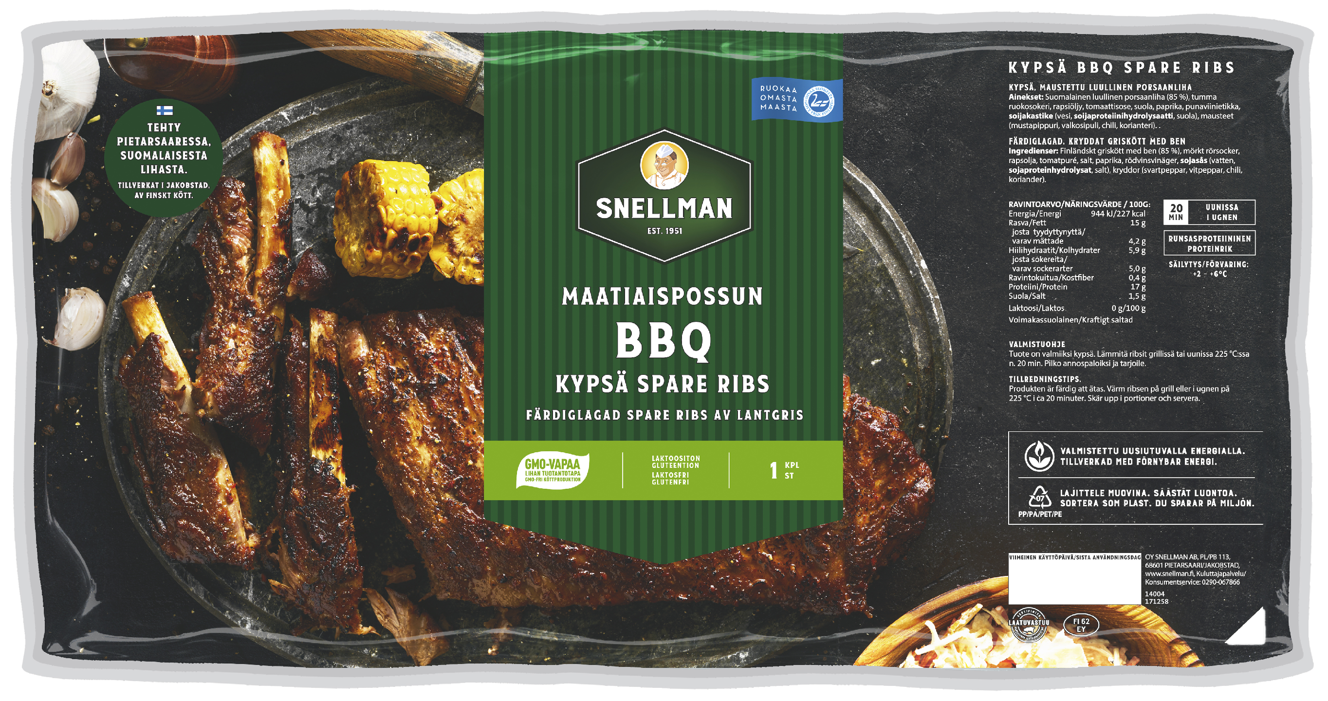 Maatiaispossun kypsät spare ribsit on maustettu herkullisella BBQ-kastikkeella, ja vieläpä täysin ilman lisäaineita. Normaalisti spare ribsit vaativat pitkän kypsennysajan, mutta näille valmiiksi kypsille ribseille riittää nopea viimeistely grillissä tai uunissa. Kotimaista maatiaispossua perhetiloilta. Pakkauspaino vaihtelee noin 700-1300 g:n välillä. Yksittäisen tuotteen keskimääräinen paino on 900 g.