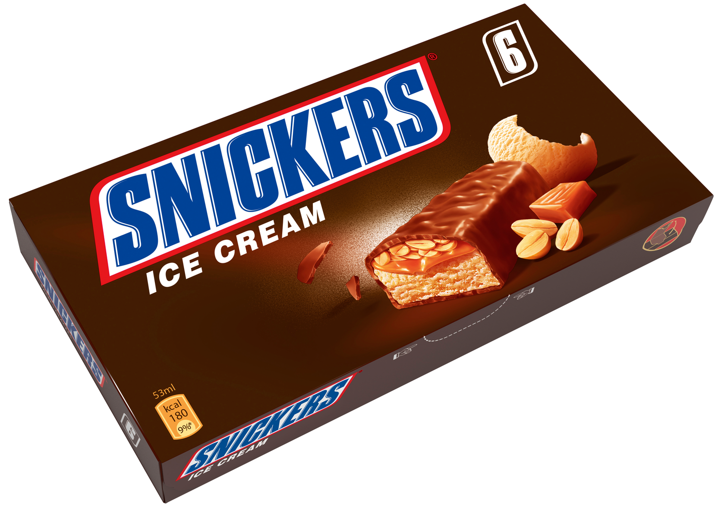 SNICKERS®-kermajäätelöpatukka sisältää kermajäätelöä, paahdettuja pähkinöitä ja karamelliä kaakaokuorrutuksen sisällä. SNICKERS® kermajäätelöpatukka 6*48g