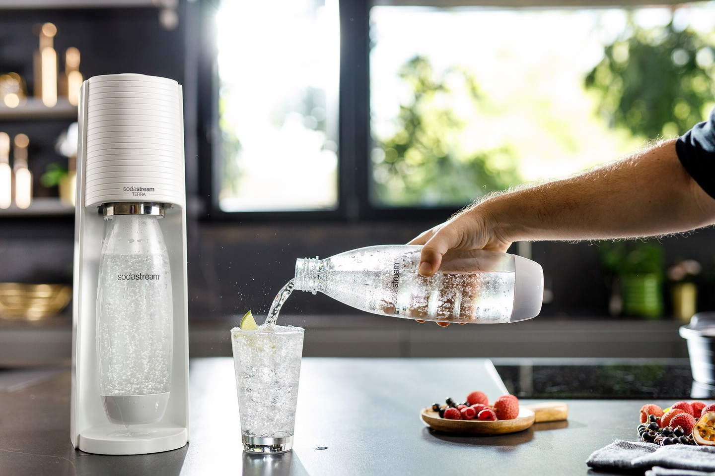 Tyylikäs Terra™-hiilihapotuslaite on valmis tarjoamaan sinulle virkistäviä kuplia sähköttömästi. Manuaalinen hiilihapotuslaite ei vaadi sähköä – tarvitset vain Terra™ -hiilihapotuslaitteen mukana tulevan hiilidioksidisylinterin, ja olet valmis päättämään oman kuplatasosi mieltymystesi mukaan. Yksi tämän laitteen erinomaisista ominaisuuksista on snap-lock-mekanismi, joka on kätevämpi tapa asettaa pullo paikoilleen ilman kiertämistä. Laitteen mukana tulee astianpesukoneen kestävä juomapullo, joka tarjoaa helpon huollon sekä ''Quick Connect'' -sylinteriasennus, patenttia odottava tekniikka nopeaan ja yksinkertaiseen sylinterin asentamiseen ilman kiertämistä.