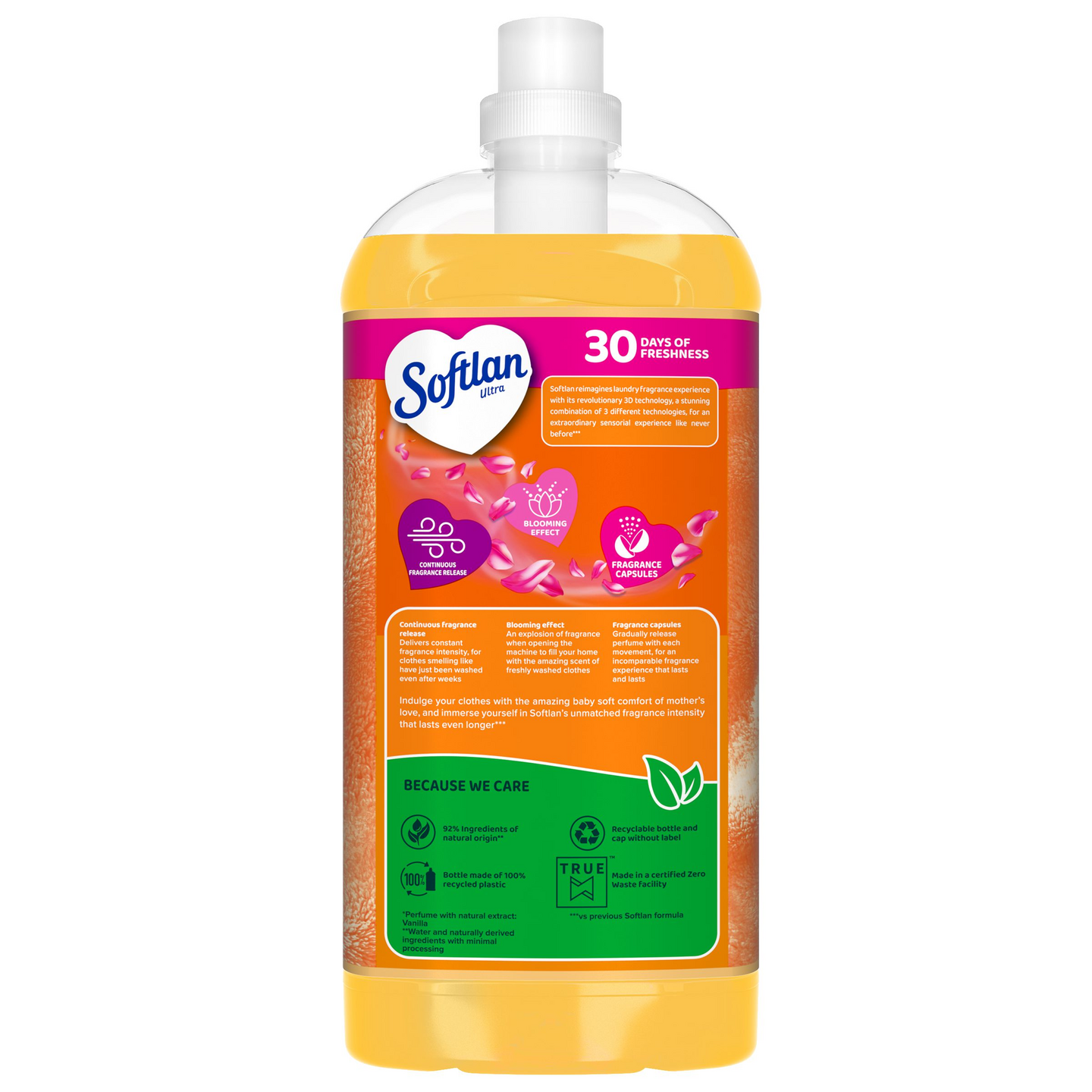 Softlan Vanilla & Orchid -huuhteluaine tekee pyykistäsi ihastuttavan pehmeää ja helppoa käsitellä, ja jättää peräänsä jopa 30 päivää kestävän vanilijan ja orkidean tuoksun. Uusi 3D-tuoksuteknologiamme, jossa yhdistyy kolme eri tekniikkaa tuomaan elämyksellisen ja pitkäkestoisen tuoksukokemuksen, saa vaatteesi tuoksumaan vastapestyiltä jopa säilytyksen jälkeen. Softlan Vanilla & Orchid -huuhteluaineen dermatologisesti testattu koostumus soveltuu kaikille kankaille, tekee pyykistäsi helpommin käsiteltävää ja auttaa pitämään vaatteistasi huolta suojaamalla kankaiden kuituja pesun aikana.