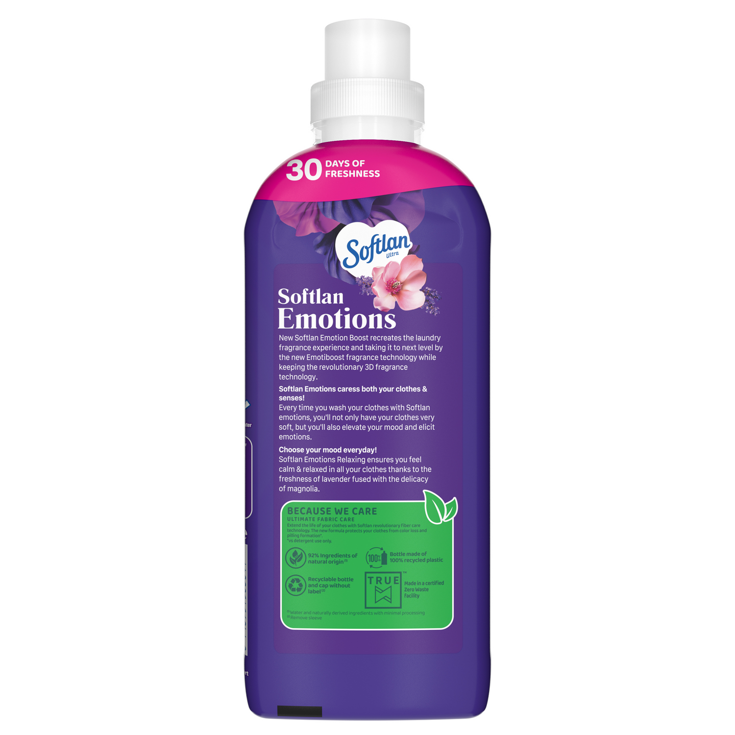 Softlan Emotions Relaxing Magnolia & Lavender -huuhteluaine tekee pyykistäsi ihastuttavan pehmeää ja helppoa käsitellä. Se jättää peräänsä jopa 30 päivää kestävän syvän magnolian ja rentouttavan laventelin tuoksun, jonka Emotiboost-teknologia on suunniteltu parantamaan mielialaa. Soveltuu kaikille kankaille ja tekee pyykistäsi helpommin käsiteltävää kuin pelkällä pesuaineella pestynä. Softlan Emotions Relaxing Magnolia & Lavender -huuhteluaineen pullo on valmistettu 100% kierrätetystä muovista, ja voit myös uudelleen kierrättää sen korkin kanssa.