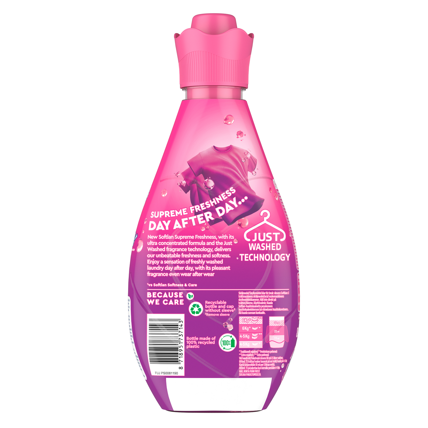 Uusi Softlan Supreme Freshness Floral Fusion -huuhteluainetiiviste pitää vaatteesi ihastuttavan tuoksuisina päivästä päivään. Huuhteluaine pehmentää vaatteita ja suojaa nukkaantumiselta sekä värin haalistumiselta* – myös kylmällä vedellä pestäessä. Dermatologisesti testattu ja pakattu 100% kierrätettyyn ja kierrätettävään pulloon.