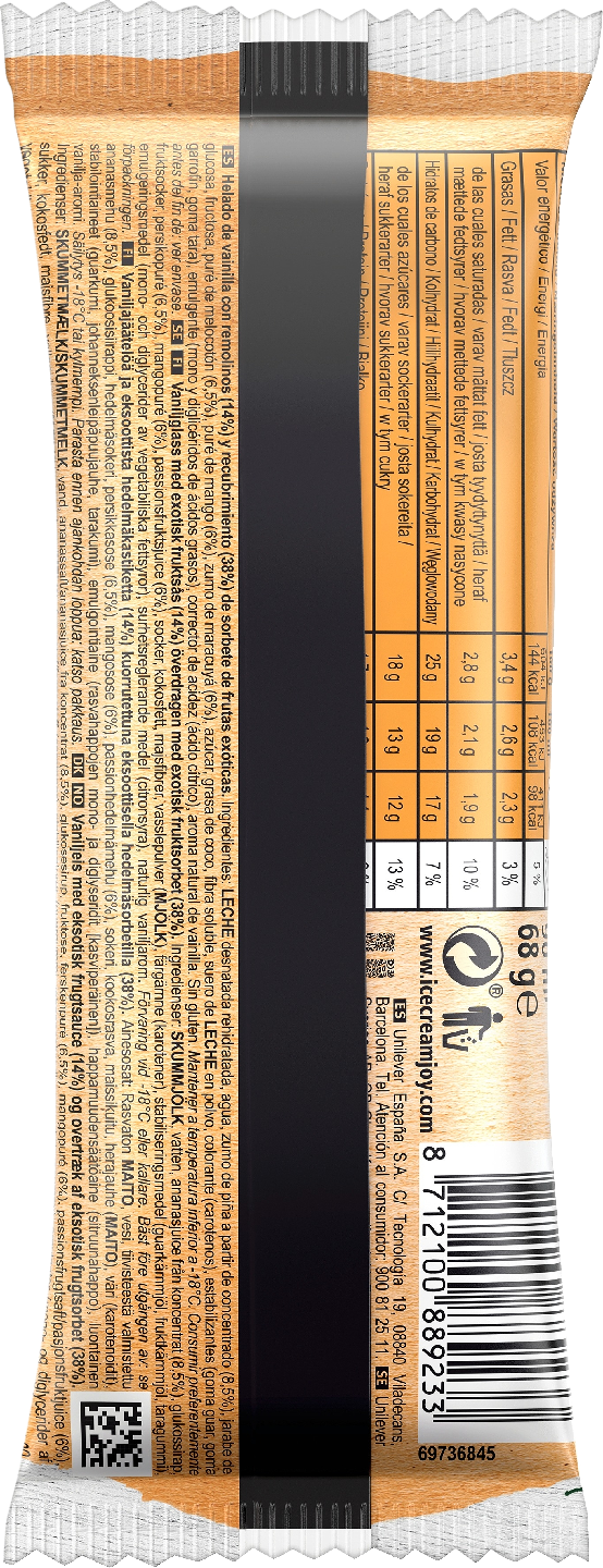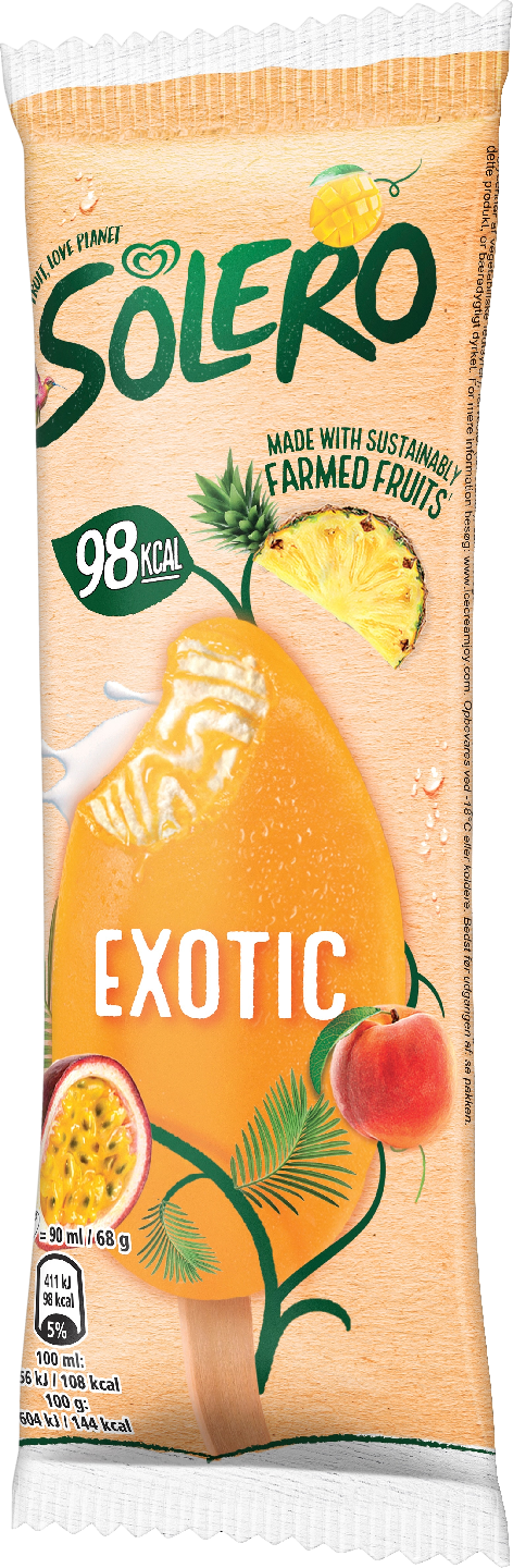 Raikas Solero Exotic -jäätelöpuikko on hedelmien ystävän valinta. Solero on jäätelö, joka ei sisällä keinotekoisia väri- tai makuaineita. Jäätelön maku on herkullisen hedelmäinen ja energiaa on enintään 98 kcal. Raaka-aineina käytettävät hedelmät ovat peräisin tuntemistamme luotetuista lähteistä – kestävästi toimivilta viljelmiltä, joilla tehdään töitä ympäristöä kunnioittaen. Todellisille Solero-puikkojäätelön faneille suosittelemme monipakkausta, joka sisältää 3 kappaletta Solero Exoctic -jäätelöpuikkoja. Tutustu myös 900 ml Solero-jäätelöpakettiin. Jäätelö on superhelppo, ihanan viileä jälkiruoka, joka maistuu lähes jokaiselle, niin lapsille kuin aikuisille. Jäätelö on ratkaisu pieneen makeannälkään tai silloin, kun saat yllätysvieraita ja haluat hieman juhlistaa tilaisuutta. Jäätelö ilostuttaa päivän pienissä hetkissä ja nostaa tavanomaisenkin ruokailun arjen yläpuolelle. Eniten jäätelöä syödään kesäkuukausina, mutta useimpien mielestä jäätelö maistuu yhtä hyvälle vuodenajasta riippumatta. Muista, että jäätelö säilyy parhaiten -18 asteen lämpötilassa tai kylmemmässä. Moni tykkää jäätelöstä pakastinkylmänä, kun taas toiset antavat jäätelön sulaa huoneenlämmössä hetken ennen nauttimista – jos vain malttavat. Jäätelövalikoimastamme löytyy tuttuja klassikoita ja jännittäviä uutuuksia, joita kehitämme muuttuvien makujen mukaan. Jäätelöillämme on vahva yhteys kaikenikäisten jäätelörakastajien kanssa ja haluamme olla mukana ilon hetkissä. Unileverin jäätelöt luovat päivittäin ympäri maailmaa onnenhetkiä ihmisille. Juhlistamme tätä toimintaa sponsoroimalla virallisesti Yhdistyneiden kansakuntien kestävän kehityksen ratkaisuverkoston (SDSN) onnellisuusraporttia. Olemme tuoneet ihmisiä yhteen jäätelön avulla ja levittäneet onnellisuutta sosiaalisten yhteyksien kautta. Sponsorointisopimus on uusin askel Unileverin sitoutumisessa kansallisten onnellisuustasojen nostamiseen. Se on osa meidän pyrkimystä korostaa ihmisten välisten sosiaalisten yhteyksien merkitystä onnellisuuden lisäämisessä.