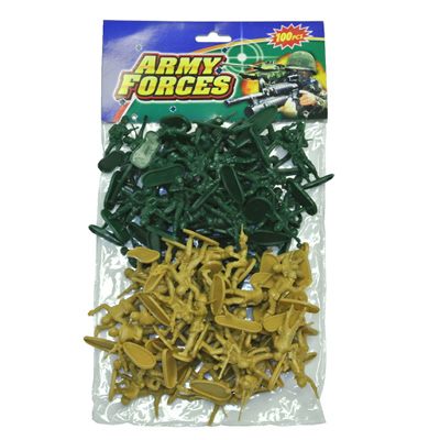 Pakkaus sisältää 100 kpl muovisia sotilaita. Ikäsuositus yli 3-vuotiaille.