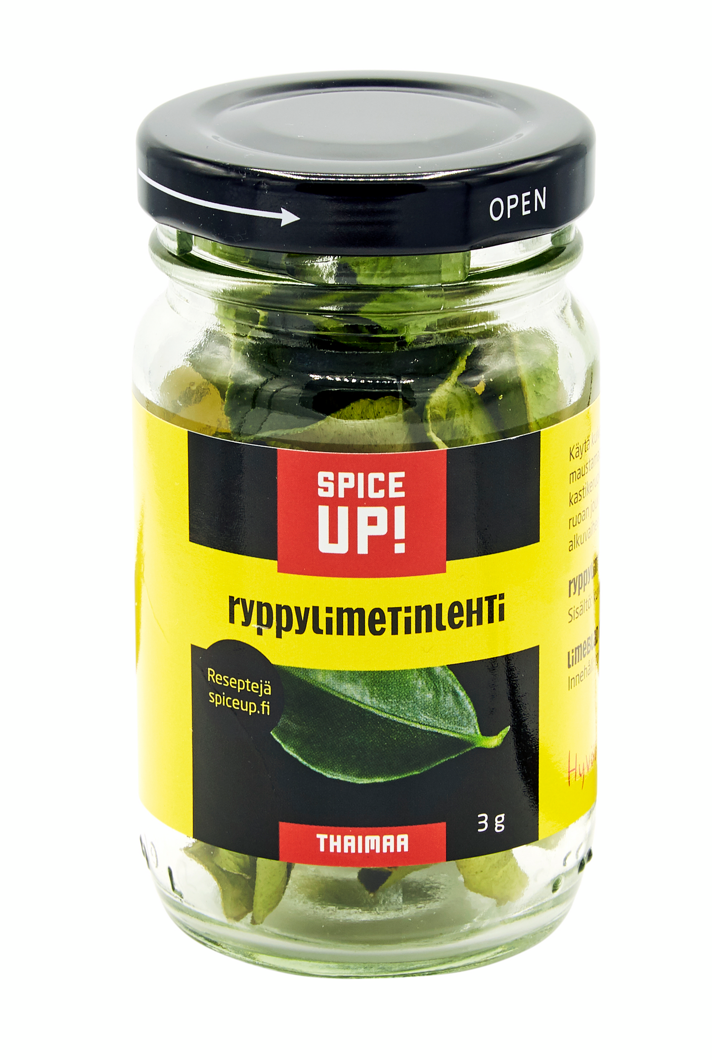 Ryppylimetinlehti (bai makrut) on Kaakkois-Aasiassa kasvavan pienen sitrushedelmäpuun eli ryppylimettipuun lehti. Lehdet kuuluvat tärkeänä osana thaimaalaista ja indonesialaista keittiötä. Ryppylimetinlehteä käytetään ruoissa laakerilehden tapaan. Kuivatut ryppylimetinlehdet lisätään ruoan joukkoon valmistuksen alkuvaiheessa. Lehti antaa ruokiin voimakkaan, miellyttävän ja raikkaan limetin maun ja aromin. Spice Up! Ryppylimetinlehti (3 g) on pakattu pieneen lasipurkkiin. Säilytä purkkia kuivassa, viileässä paikassa, valolta suojattuna. Käytä lehtiä esimerkiksi tom yam ja tom kha keittoihin sekä thaimaalaisiin curryihin. Kokeile myös tavalliseen kalakeittoon ja pataruokiin.