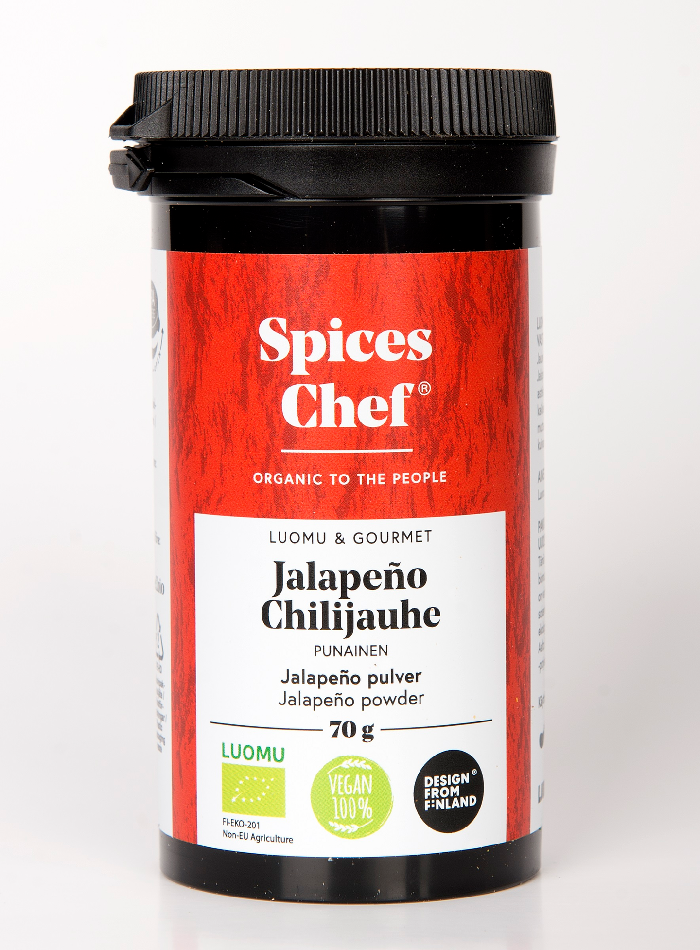 LUOMUMAUSTEET VASTUULLISESTI Luomu Jalapeño Chillijauhe punainen. Jauhe kypsästä punaisesta Jalapeñosta. Tulisuus Scovillen asteikolla SHU 15000. Käytä kaikkeen ruoanlaittoon. Tulinen mutta ei polttava. PAKKAUS – KÄYTÄ UUDELLEEN TAI KIERRÄTÄ Tämä maustepurkki on biomuovia ja BPA-vapaa. Se on valmistettu vastuullisesti sokeriruo'osta. Pakkaus on ekologinen ja se on kehitetty Aalto Yliopiston Pack-Age projektissa. Käytä uudelleen tai kierrätä. KÄYTTÖ: Kasvis, Liha, Kana, Riista, Kala, Äyriäiset.