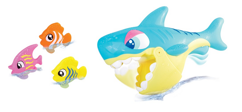 Hauska Hai-kylpyleikkisetissä mukana myös 3 kelluvaa pikkukalaa. Ikäsuositus1+.