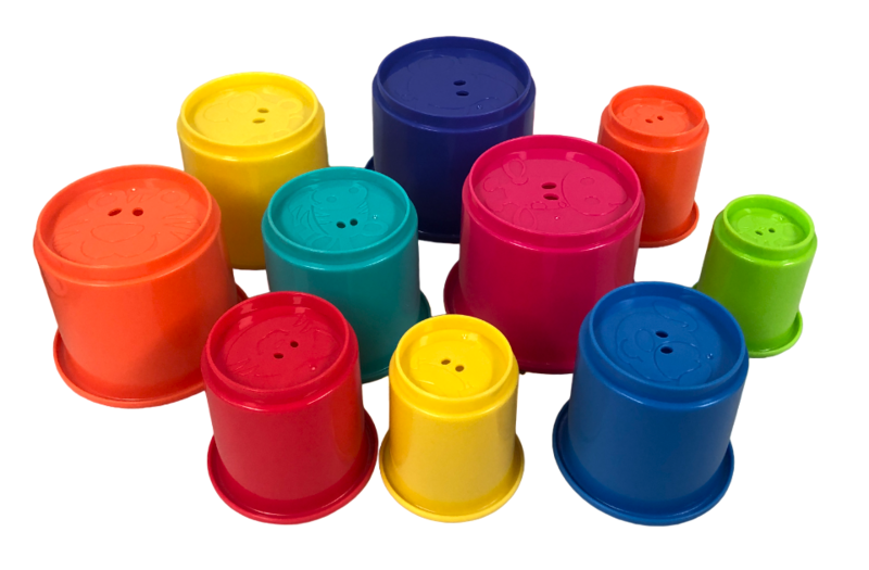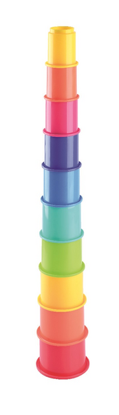 10 värikästä kuppia, jotka pinoutuvat päällekkäin. Pinon korkeus 63,5 cm.