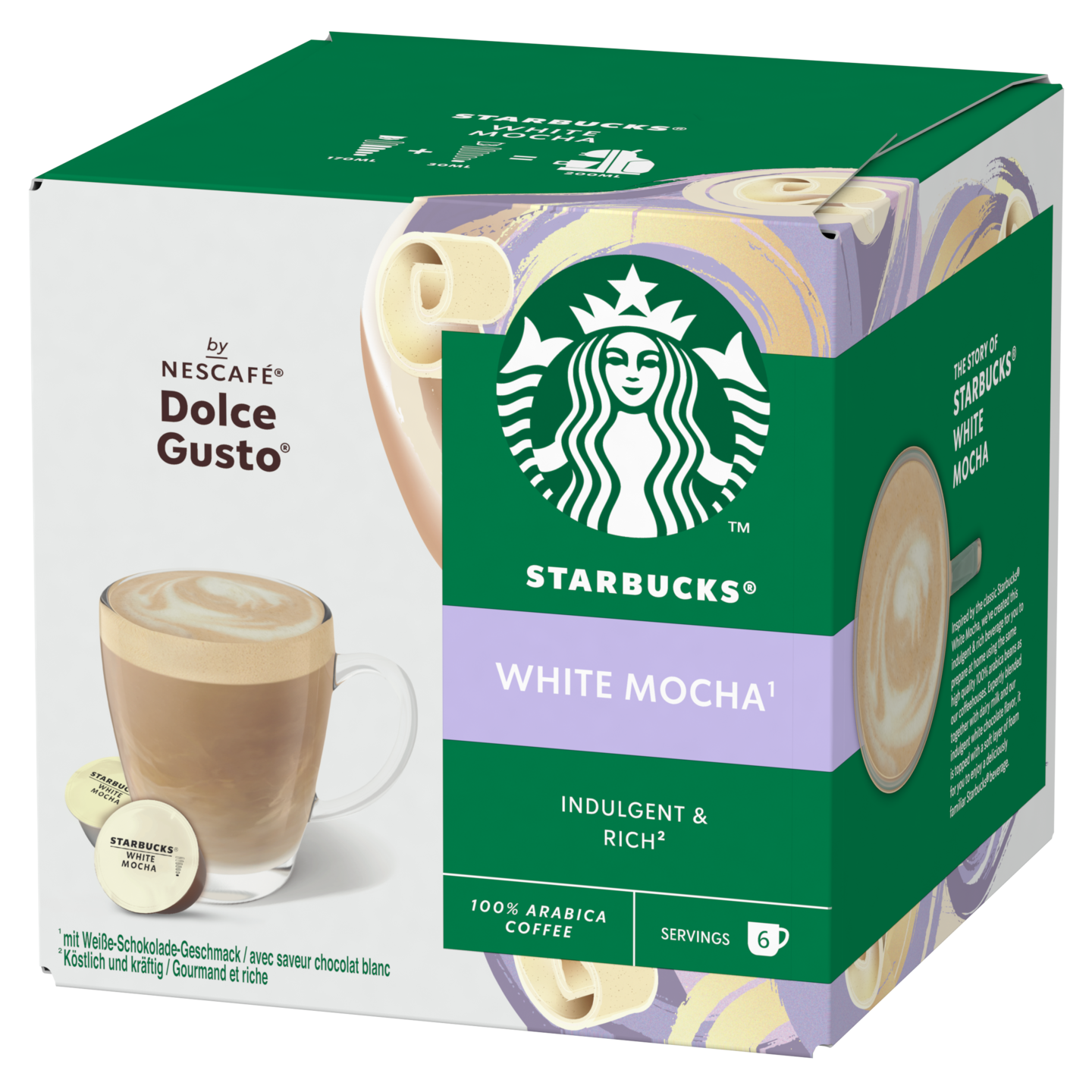 Starbucks White Mocha -kapselikahvissa yhdistyvät 100 % arabica kahvi, hemmottelevan valkosuklainen mokka sekä pehmeä vaahtokerros.