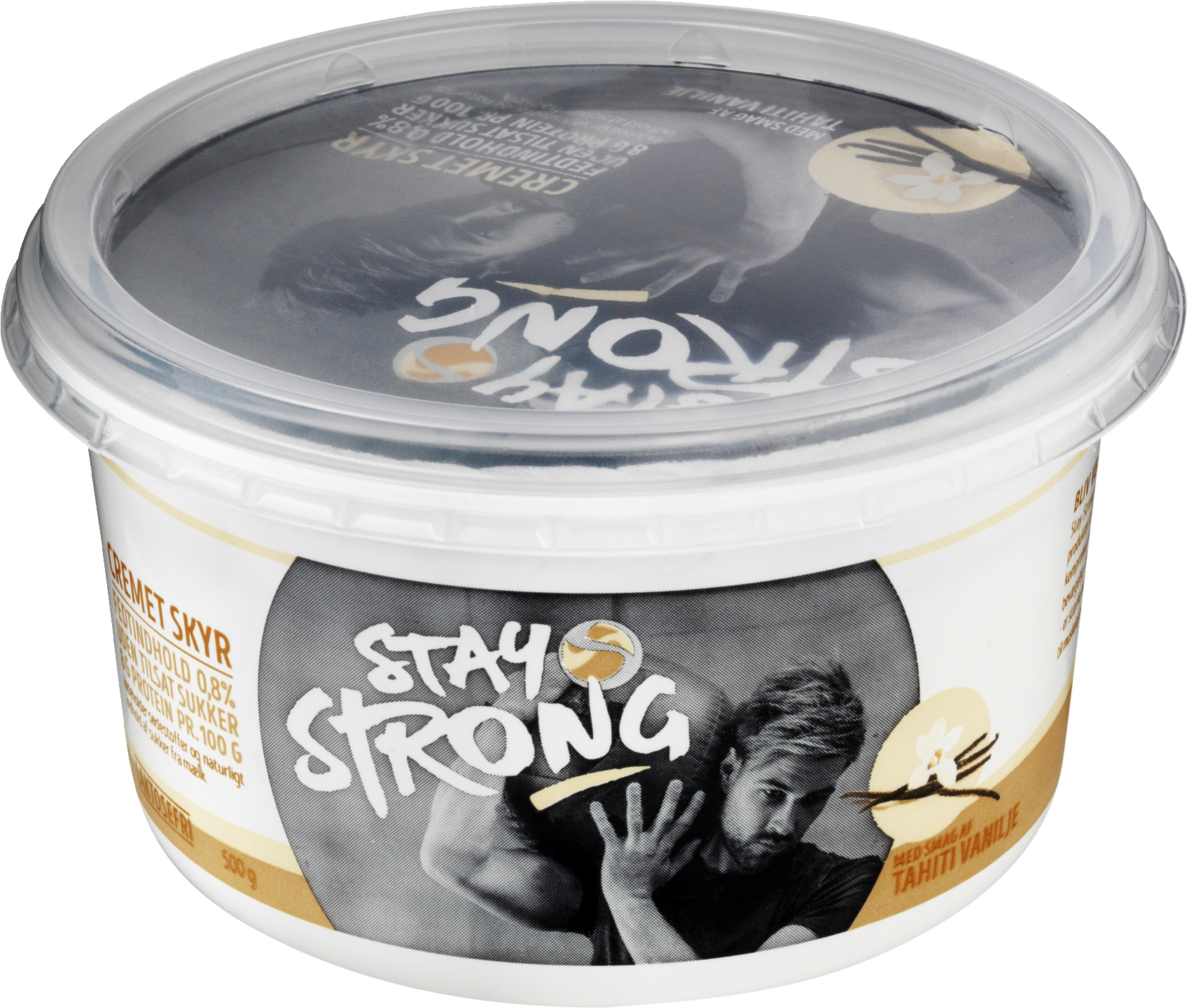 Stay Strong Skyr on laktoositon ja siinä on täyteläinen vaniljan maku. Sisältää makeutusaineita. Ei lisättyä sokeria, vaan luonnollista sokeria maidosta.