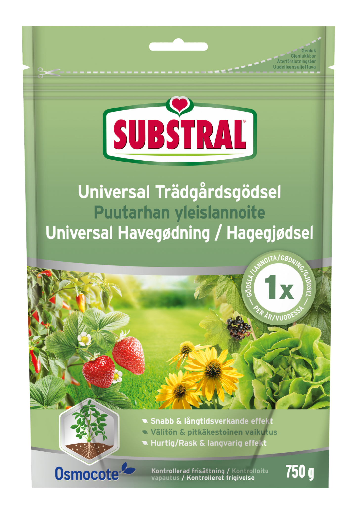 Substral puutarhan yleislannoite soveltuu käytettäväksi sekä puutarhan syötävillä että koristekasveilla.
