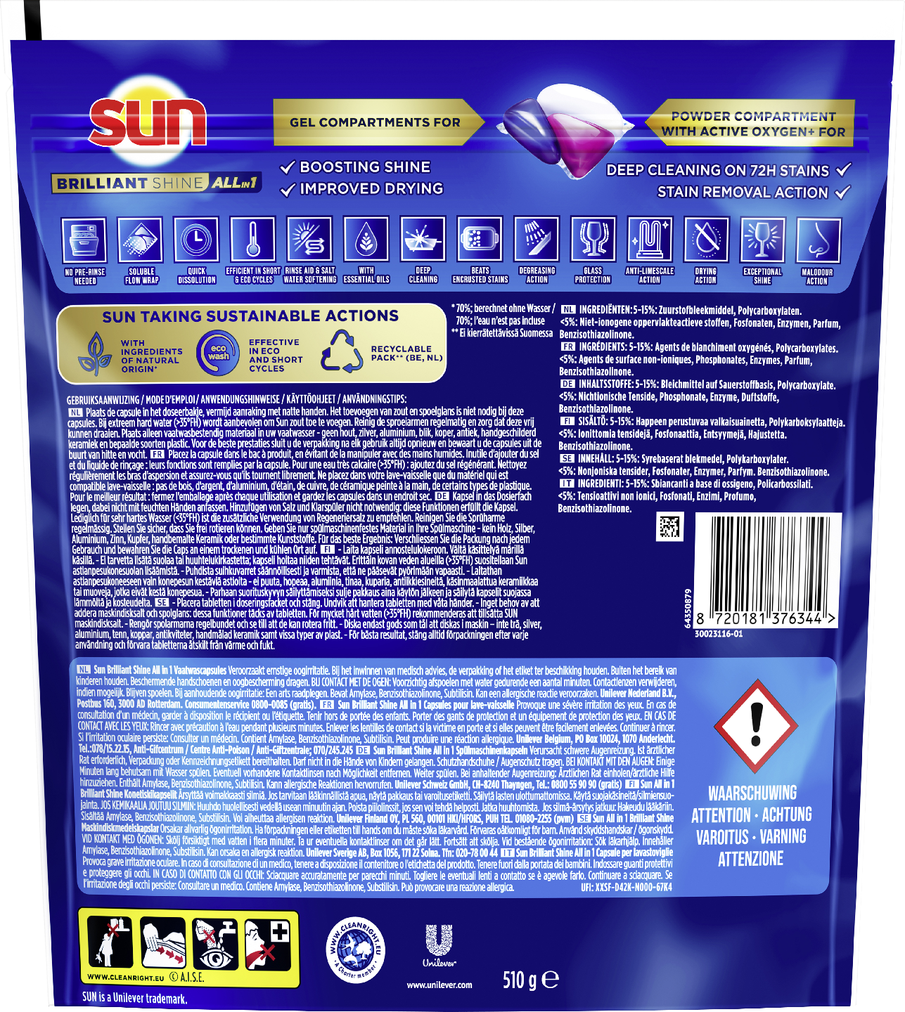 Säihkyvää kirkkautta pesusta pesuun. Sun Brilliant Shine on optimoiduin pesutuotteemme. Konetiskitabletti All-in-1 tarjoaa poikkeuksellista pesutehoa, vaikka siinä on käytetty vähemmän kemikaaleja! Nestemäisen ja jauhemaisen koostumuksen parhaat puolet yhdistyvät tässä kompaktissa 3-tehoisessa tabletissa, joka syväpuhdistaa, antaa astioille säihkyvää kirkkautta ja raikkaan tuoksun. Sun Brilliant Shine All-in-1-tabletit sisältävät huuhtelukirkasteen ja pesukoneelle tarkoitettua suolaa. Tabletti pesee astiat tahrattoman puhtaiksi ja samalla hoituu myös tiskikoneen puhdistus. Parhaan suorituskyvyn säilyttämiseksi, sulje pakkaus aina käytön jälkeen. Säilytä kapselit suojassa lämmöltä ja kosteudelta. Sun Brilliant Shine -konetiskitabletti on tehokas jo pikapesussa eli pesukoneen pika- ja lyhytohjelmissa. Tahraton tulos myös eko-ohjelmien alhaisemmissa lämpötiloissa. Ei tarvetta huuhtelulle, mikä tarkoittaa pienempää energiankulutusta ja pienempää vedenkulutusta. Muita konetiskiaineita saatat joutua täydentämään muilla tuotteilla. Sun All-in-1 on konetiskikapseli, joka tekee kaiken työn yhdellä tabletilla: rasvanpoisto, kalkinpoisto, astianpesukonesuola ja huuhtelukirkaste, joten myös pesukoneen puhdistus hoituu samalla ja pesukone voi hyvin. Konetiskikapseli on uskomattoman helppokäyttöinen. Sen kääre on vesiliukoinen, joten sitä ei tarvitse poistaa. Aseta vain tabletti astianpesukoneen pesuainelokeroon ja valitse astianpesuohjelma. Yli 50 vuoden ajan, vuodesta 1965 alkaen, Sun on kehittänyt tuotteitaan entistä paremmiksi, jotta ne toimivat moitteettomasti ja takaavat parhaan pesutuloksen myös alhaisissa pesulämpötiloissa ja lyhytohjelmissa. Näin sinä pystyt säästämään vettä ja energiaa. Innovatiivisten Sun-tuotteiden avulla pidät parempaa huolta astioistasi ja myös pesukoneestasi. Ei siis ole sattumaa, että Sun on tuotemerkki, johon ihmiset luottavat – niin Suomessa kuin maailmalla.