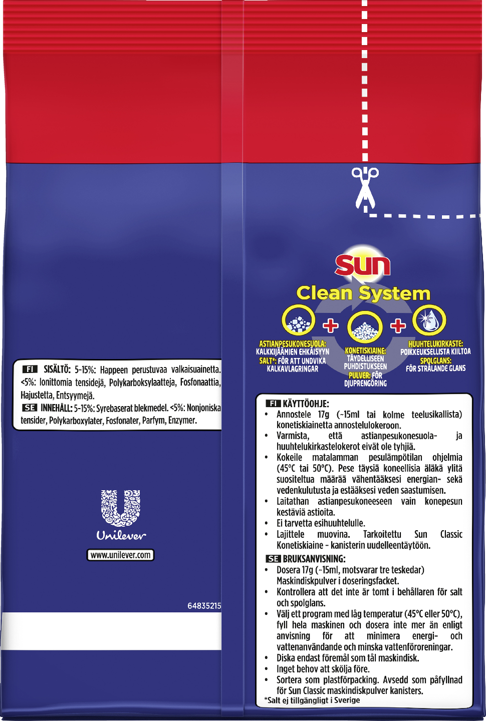 Sun Classic täyttöpakkaus konetiskijauhe on tehokas konetiskiaine, jonka entistä tiiviimpi koostumus tarjoaa enemmän pesukertoja. Käytä Sun Classic konetiskijauhetta astioiden tehokkaaseen puhdistukseen. Uusi, entistä tiiviimpi ja tehokas koostumus antaa erinomaisen pesutuloksen jo 50 °C asteen pesulämpötiloissa. Tuotteella on ympäristömerkki. Nyt saat ja jopa 93 % enemmän pesukertoja pakkausta kohti verrattuna aikaisempaan koostumukseen. Voit annostella konetiskijauhetta juuri sopivasti pestävien astioiden määrän ja niiden likaisuuden mukaan. Sun poistaa tehokkaasti rasvaa ja pinttyneitäkin tahroja, ja saa astiat tuoksumaan puhtaan raikkailta. Täydellisen puhdasta! Saat parhaat tulokset käyttämällä Sun Classicia yhdessä Sun Classicin huhteluun tarkoitetun kirkasteen kanssa. Noudata koneen valmistajan suosituksia. Muista myös puhdistaa astianpesukoneen pohjassa oleva siivilä (suodatin) säännöllisesti, jotta tiskikone pesee astiat varmasti puhtaaksi. Oletko kokeillut Sun Classic Regular -konetiskitablettia tai muita Sun-tuotteita, kuten Sun Konetiskigeeli All-in-1 Lemonia, jossa on raikas sitruunan tuoksu. Sun-konetiskijauheen tapaan Sun All-in-1 Lemon -konetiskigeeliä on helppo annostella tiskikoneeseen juuri tiskille sopiva määrä. Kevyesti likaantuneille astioille riittävä pesuainemäärä on pienempi kuin pinttyneille astioille. Sun elää innovaatiosta ja haluaa edistää kestävää elämäntapaa. Haluamme että tuotteemme ovat tehokkaita, mutta eivät rasita ympäristöä. Yli 50 vuoden ajan (vuodesta 1965 alkaen) Sun on kehittäny tuotteitaan entistä paremmiksi, jotta ne toimivat moitteettomasti ja takaavat parhaan pesutuloksen myös alhaisissa lämpötiloissa ja astianpesukoneiden lyhytohjelmissa. Näin sinä pystyt säästämään vettä ja energiaa. Innovatiivisten Sun-tuotteiden avulla pidät parempaa huolta astioistasi ja myös pesukoneestasi. Ei siis ole sattumaa, että Sun on tuotemerkki, johon ihmiset luottavat – niin Suomessa kuin maailmalla.