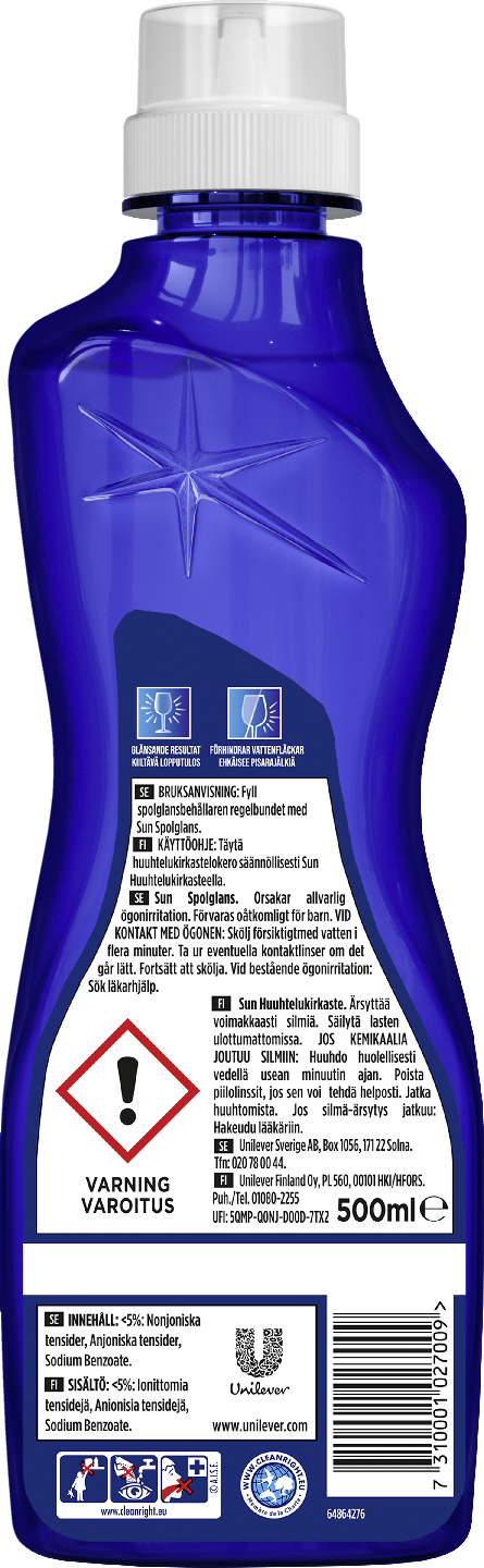 Päivällinen on syöty. Vieraat ovat nousseet pöydästä. Nyt on aika korjata likaiset astiat ja täyttää astianpesukone: ruokailuvälineet, lasit, lautaset, kattilat ja muut. Siksi on mukava tietää, että tiskauksessa apunasi on todellinen ammattilainen, Sun Regular -konetiskiaineen ja -tabletin paras kaveri: Sun Regular -huuhtelukirkaste. Kun haluat saada erityisen kirkkaat ja tahrattomat astiat, käytä Sun -huuhtelukirkastetta. Se valuttaa ylimääräisen veden lautasten, lasien ja kulhojen pinnalta. Annostele huuhtelukirkaste käyttöohjeen mukaan, jotta saat parhaan lopputuloksen. Sun Regular on tehokas huuhtelukirkaste, joka poistaa tehokkaasti kalkkijäämät ja vesitahrat. Se on tiivistetty ja neutraali huuhteluaine, joka puhdistaa astiat siten, että niihin ei jää tahroja, raitoja tai pisarajälkiä. Voit käyttää Sun Regular -huuhtelukirkastetta kaikentyyppisissä vesissä – kovassa vedessä, jossa on runsaasti mineraaleja, sekä pehmeässä vedessä. Tuloksena on puhtaat, kiiltävät ja hohtavat astiat ja uskomaton raikkauden tunne. Huuhtelukirkaste varmistaa, että vesi valuu astioista vauhdikkaammin. Näin ne kuivuvat myös nopeammin pesun jälkeen. Tämä säästää paljon aikaa ja turhaa työtä kuivauspyyhkeen kanssa. Kun käytät Sun Regular -huuhtelukirkastetta, se vähentää ruoanlaitossa ja ruokailussa syntyvien ruokatahrojen pinttymistä kiinni astioihin. Sun Regular -huuhtelukirkastetta suosittelevat tunnetut ruokailu- ja ruoanlaittovälineitä valmistavat tuotemerkit, kuten Tefal, Curver ja Bormioli Rocco. Huolehdi lisäksi astianpesukoneen puhtaudesta käyttämällä astianpesukoneen puhdistusainetta. Jos astiat näyttävät edelleen likaisilta konepesun jälkeen, voi syy olla likaisessa astianpesukoneessa. Käytä koneen pesuun esimerkiksi Sun Astianpesukoneen puhdistusainetta. Sun Regular -huuhtelukirkasteella on ympäristömerkki.