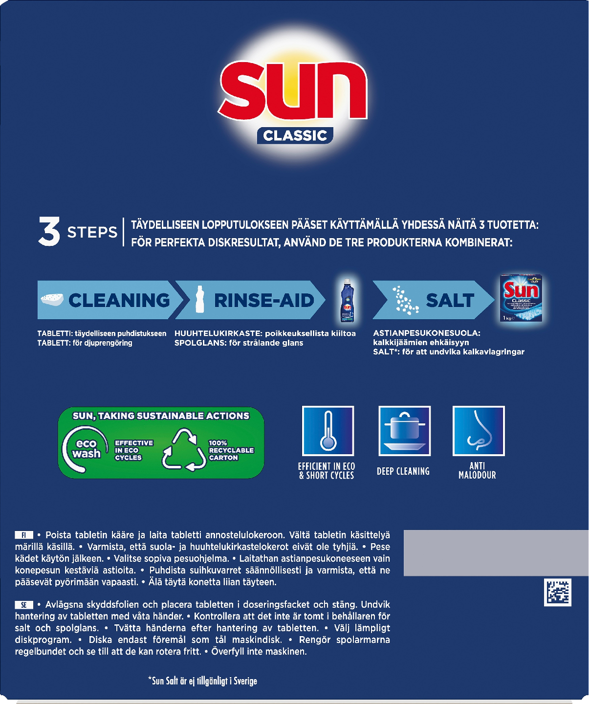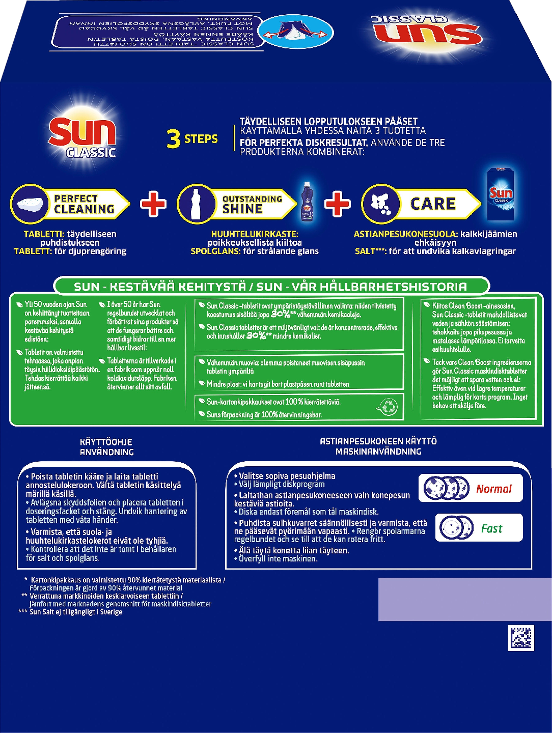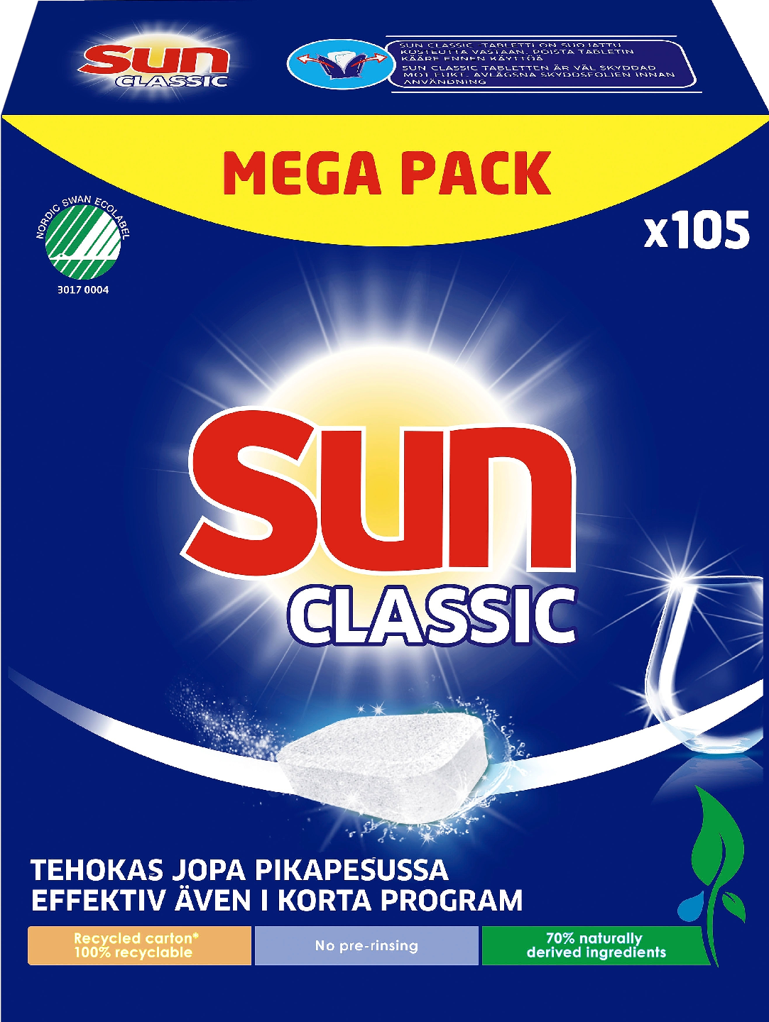 Sun Classic Regular -konetiskitabletti (105 kpl pakkaus) pesee astiat kirkkaan puhtaaksi! Pikapesu, normaali ohjelma tai alhainen lämpötila – valitse mikä vaan, Sun Classic saa astiasi kiiltämään. Tabletti pesee loistavan puhtaiksi niin lautaset, lasit ja ruokailuvälineet kuin rasvaiset kattilat ja pannut. Rasva lähtee ja saat puhdasta jälkeä jo pikaohjelmalla. Cleanboost-menetelmänsä ansiosta Sun Classic Regular -konetiskitabletti säästää vettä ja energiaa: tehokas jo lyhytohjelmissa ja alhaisissa lämpötiloissa. Voit pestä jo 50°C pesulämpötilassa, joka riittää loistavaan pesutulokseen. Astioita ei tarvitse esihuuhdella, sillä Sun Classicin teho riittää. Sun-astianpesukonetabletit on pakattu kierrätettyyn ja uudelleen kierrätettävään pakkaukseen. Sun Classic -tabletti on pakattu liukenemattomaan kääreeseen, joka suojaa tablettia kosteudelta säilytyksen aikana. Muista poistaa astianpesukonetabletin suojapakkaus ennen käyttöä. Käytä näin: Avaa astianpesukone, poista tabletista kääre. Aseta tabletti astianpesukoneen annostelukoteloon ja sulje kone. Vältä tabletin käsittelemistä märin käsin. Saat moitteettoman lopputuloksen käyttämällä kolmen tuotteen yhdistelmää: 1) Tabletti syväpuhdistukseen 2) Huuhtelukirkaste poikkeukselliseen kiiltoon 3) Atianpesukonesuola – suola estää kalkkijäämiä. Saat parhaat tulokset käyttämällä Sun Classicia yhdessä Sun Classicin huhteluun tarkoitetun kirkasteen kanssa. Noudata koneen valmistajan suosituksia. Muista myös puhdistaa astianpesukoneen pohjassa oleva siivilä (suodatin) säännöllisesti, jotta astianpesukone pesee astiat varmasti puhtaaksi.