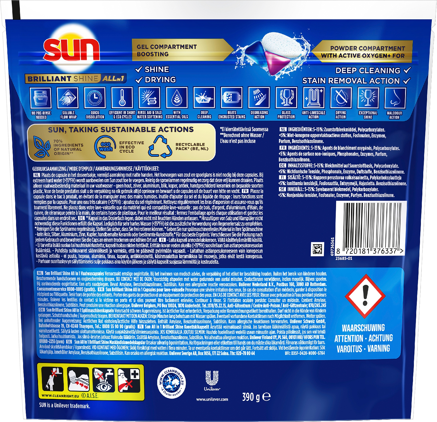 Säihkyvää kirkkautta pesusta pesuun. Sun Brilliant Shine All in one on optimoiduin pesutuotteemme. Konetiskitabletti All-in-1 tarjoaa poikkeuksellista pesutehoa, vaikka siinä on käytetty vähemmän kemikaaleja! Nestemäisen ja jauhemaisen koostumuksen parhaat puolet yhdistyvät tässä kompaktissa 3-tehoisessa kapselissa, joka syväpuhdistaa, antaa astioille säihkyvää kirkkautta ja raikkaan tuoksun. Sun Brilliant Shine All-in-1-kapselit sisältävät huuhtelukirkasteen ja pesukoneelle tarkoitettua suolaa. Tabletti pesee astiat tahrattoman puhtaiksi ja samalla hoituu myös tiskikoneen puhdistus. Parhaan suorituskyvyn säilyttämiseksi, sulje pakkaus aina käytön jälkeen. Säilytä kapselit suojassa lämmöltä ja kosteudelta. Sun Brilliant Shine -konetiskitabletti on tehokas jo pikapesussa eli pesukoneen pika- ja lyhytohjelmissa. Tahraton tulos myös eko-ohjelmien alhaisemmissa lämpötiloissa. Ei tarvetta huuhtelulle, mikä tarkoittaa pienempää energiankulutusta ja pienempää vedenkulutusta. Muita konetiskiaineita saatat joutua täydentämään muilla tuotteilla. Sun All-in-1 on konetiskikapseli, joka tekee kaiken työn yhdellä tabletilla: rasvanpoisto, kalkinpoisto, astianpesukonesuola ja huuhtelukirkaste, joten myös pesukoneen puhdistus hoituu samalla ja pesukone voi hyvin. Sun konetiskikapseli on uskomattoman helppokäyttöinen. Sen kääre on vesiliukoinen, joten sitä ei tarvitse poistaa. Aseta vain kapseli astianpesukoneen pesuainelokeroon ja valitse astianpesuohjelma. Sun elää innovaatiosta ja haluaa edistää kestävää elämäntapaa. Haluamme että tuotteemme ovat tehokkaita, mutta eivät rasita ympäristöä. Yli 50 vuoden ajan, vuodesta 1965 alkaen, Sun on kehittänyt tuotteitaan entistä paremmiksi, jotta ne toimivat moitteettomasti ja takaavat parhaan pesutuloksen myös alhaisissa pesulämpötiloissa ja lyhytohjelmissa. Näin sinä pystyt säästämään vettä ja energiaa. Innovatiivisten Sun-tuotteiden avulla pidät parempaa huolta astioistasi ja myös pesukoneestasi. Ei siis ole sattumaa, että Sun on tuotemerkki, johon ihmiset luottavat – niin Suomessa kuin maailmalla.