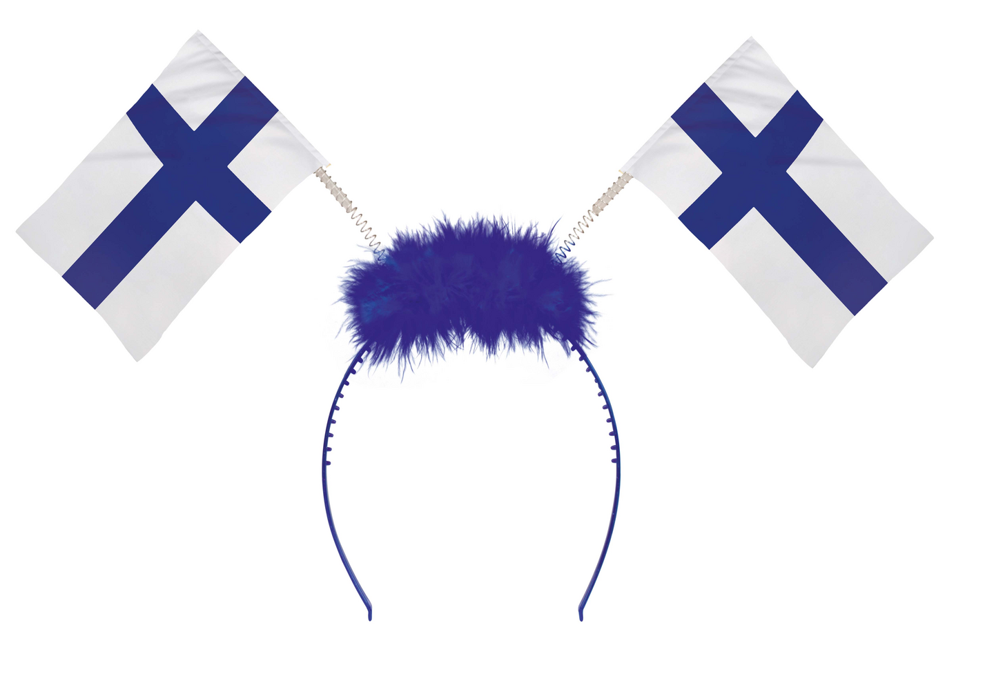 Sinisessä pääpannassa on Suomen liput vietereiden päissä sekä sininen tupsu keskellä. Aikuisten koko 13 x 29 cm.