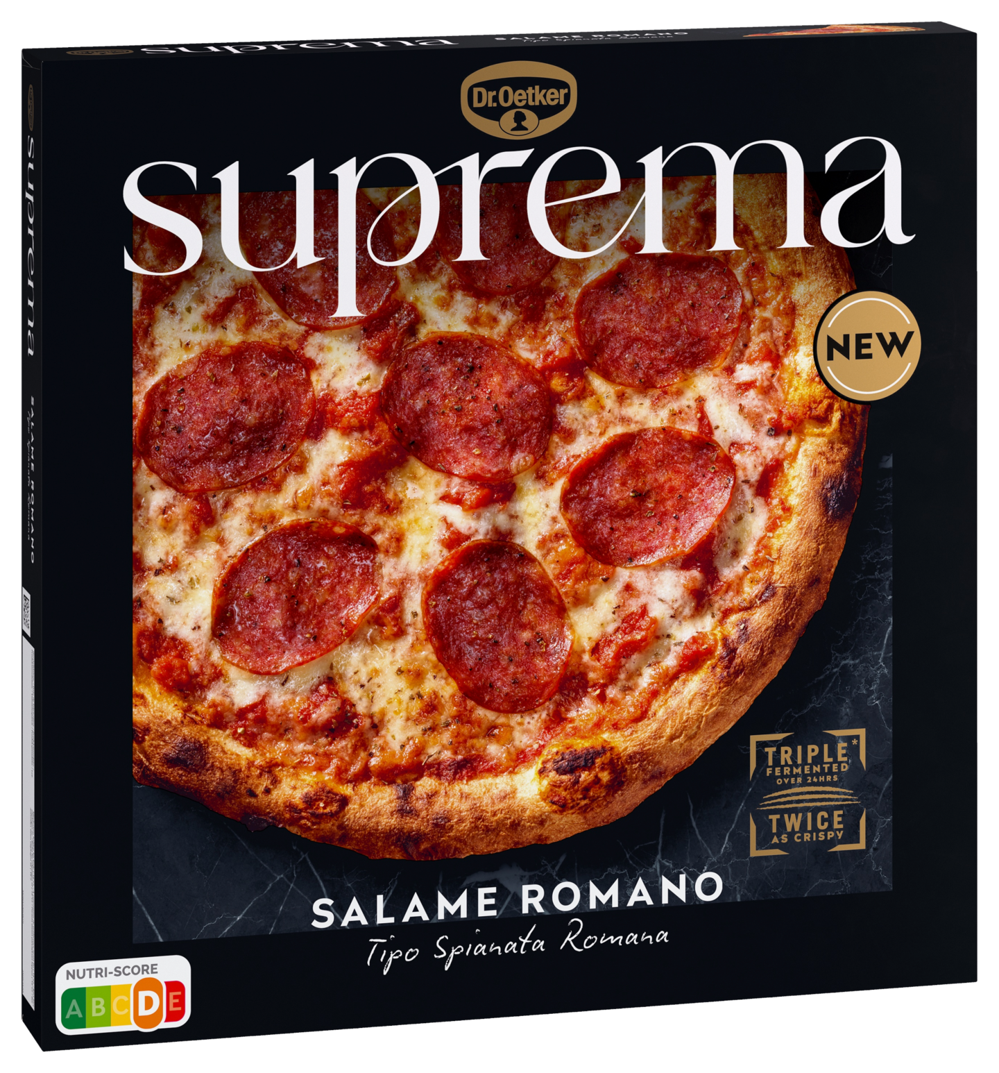 Dr. Oetker Suprema on aito premiumpizza. Taikina kohoaa kolmessa vaiheessa yli 24 tunnin aikana tarkimpien pizzastandardien mukaisesti. Paistamme pohjan 400°C:ssa italialaisessa kiviuunissa ja täytämme pizzan tuoreista, kypsistä tomaateista tehdyllä kastikkeella. Ja juuri siksi siinä on voittamaton maku; se on ilmava sisältä ja herkullisen rapea päältä. Klassisen Salame pizzan täytimme perinteisellä roomalaisella Spinata Romana –salamilla. Maku on viimeistelty ja erityisen maistuva. Kolmesti kohotettu. Tuplasti rapea. Yksinkertaisesti Suprema.