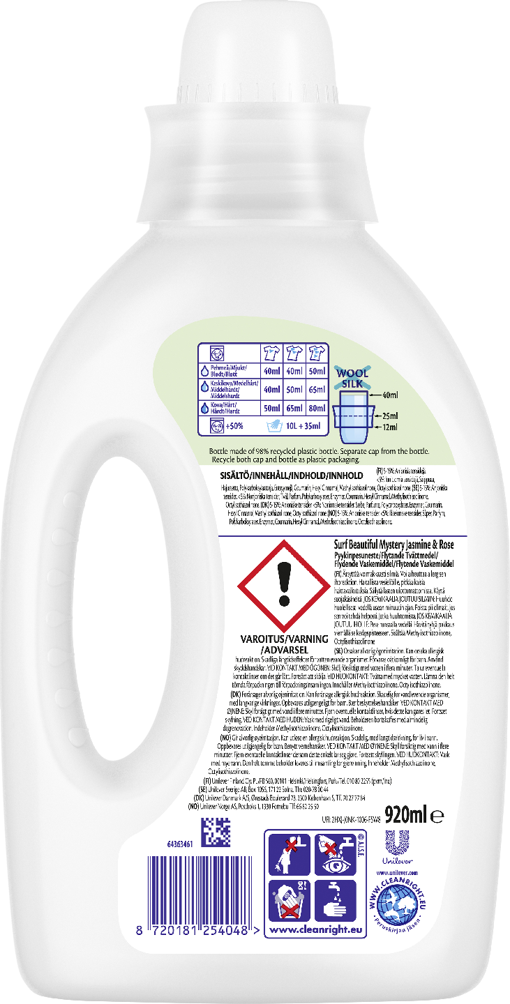 Surf Beautiful Mystery -pyykinpesuaine huolehtii vaatteistasi. Nestemäinen pesuaine antaa vaatteillesi ihastuttavan tuoksun, joka säilyy pitkään pesun jälkeen. Pyykistäsi tulee hohtavan puhdasta ja vasta pestyn raikasta. Pyykinpesuneste ei sisällä väriaineita, lisäksi se on tehokas myös matalissa lämpötiloissa. Surf-pullot on valmistettu kierrätysmuovista. Surf Beautiful Mystery -pyykinpesuaineen hyödyt: • Sisältää luonnosta johdettuja ainesosia • Puhtaat ja raikkaat vaatteet • Pitkäkestoinen tuoksu • Ei sisällä väriaineita • Tehokas matalissa lämpötiloissa • Kierrätysmuovista valmistettu pullo Farkut on suosittu vaatekappale, jota käyttävät lähes kaikki, iästä riippumatta. Opi muutaman pyykinpesuvinkkimme avulla pesemään farkkusi oikein. Uusien farkkujen pesu: On olemassa väite, että farkut pitäisi pestä ensimmäisen kerran vasta kuuden kuukauden käytön jälkeen. Kun peset ensimmäisen kerran uudet farkut, pesu on suositeltavaa toteuttaa haaleassa vedessä käsinpesuna, sillä kuuma vesi liuottaa helposti väriä farkkukankaasta. Käytä nestemäistä pesuainetta, jossa ei ole valkaisuainetta. Kun peset vanhat farkut, muista kääntää farkut nurinpäin ennen pesua. Käännä farkut takaisin oikeinpäin, ennen kuin laitat ne kuivumaan. Ennen farkkujen pesua kannattaa sulkea vetoketjut ja avata napit. Kannattaa myös käyttää huuhteluainetta, kuten Comfortia, joka suojaa farkkuja lialta sekä estää värien haalistumista pesussa. Mustien farkkujen pesussa suurin ongelma on värin säilyttäminen kirkkaana. Kannattaa siis käyttää yllä mainittuja konepesua välttäviä vinkkejä niin usein kuin mahdollista. Jos kuitenkin haluat pestä mustat farkkusi pesukoneessa, käännä ne nurinpäin ja laita päälle kylmä pesuohjelma. Käytä mustille vaatteille tarkoitettua pesuainetta, kuten Bio Luvil Blackia.