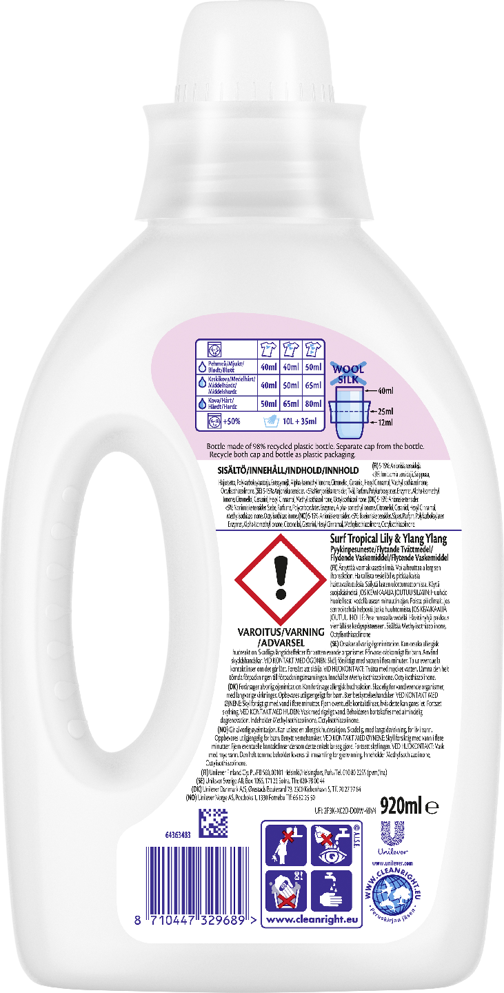 Surf Tropical Lily & Ylang Ylang -pyykinpesuneste on vaatteidesi arvoinen tehokas pyykinpesuaine, joka vie pyykkisi tuoksun aivan uudelle tasolle. Sano hyvästi lempivaatteidesi lialle sekä pinttyneillekin tahroille ja toivota tervetulleeksi uudenlainen syväpuhtaus ja trooppinen raikkaus, jollaiseen pystyy vain Surf. Surf Tropical Lily & Ylang Ylang nestemäinen pyykinpesuaine jättää tahrattomaan pyykkiisi vaikuttavan ihanan tuoksun. Nauti erinomaisesta pesutuloksesta ja pyykistä, jonka tuoksussa on pitkäkestoinen säväys trooppista liljaa, maailman yhtä suosituinta leikkokukkaa. Liljan tuoksuun yhdistyy hurmaavan, suorastaan sensuellin, Ylang ylang -kasvin viettelevän rauhoittava aromi. Surf Tropical Lily & Ylang Ylang -pesuaineella pesty pyykki on paitsi puhdasta, se myös tuntuu miellyttävältä. Vaatteidesi tuoksu hellii aistejasi ihastuttavan voimauttavalla tavalla. Surf Tropical Lily & Ylang Ylang -pyykinpesuneste pesee tehokkaasti jo silloin kun pesulämpötila on alhainen. Surf-pyykinpesunesteen pullo on tehty kierrätetystä muovista. Surf Tropical Lily & Ylang Ylang -pyykinpesunesteen edut: • Sisältää luonnosta johdettuja ainesosia. • Puhtaat ja raikkaat vaatteet • Vaatteet tuoksuvat miellyttävältä pitkään. Ihana parfyymi! • Ei sisällä väriaineita. • Tehokas jo alhaisissa pesulämpötiloissa. • Pullo tehty kierrätetystä muovista. Käyttöohjeet: Annostele Surf Tropical Lily & Ylang Ylang -pyykinpesunestettä ohjeen mukaan. Noudata myös pesukoneesi valmistajan määrittelemiä ohjeita. Seuraa aina myös vaatteidesi ohjelapussa olevia pesuohjeita. Surf Tropical Lily & Ylang Ylang -pesuaineen hurmaavan värikäs pakkaus ja raikas tuoksu tekevät pyykinpesusta hauskempaa – ja saavat pyykkisi tuoksumaan ihanalta pitkään. Surf Tropical Lily & Ylang Ylang -pesuaineella peset niin vaatteet, kuin pyyhkeet ja lakanatkin.