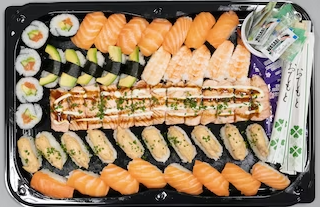 Platteri sisältää: - 10 x Chilitonnikalanigiri - 5 x Lohi-kurkku-avokadomaki - 5 x Avokadonigiri - 5 x Ebinigiri - 15 x Lohinigiri - 15 x Grillattu lohinigiri - 1 x Wasabi - 1 x Inkivääri - 5 x Puikot - 5 x Soijapussi