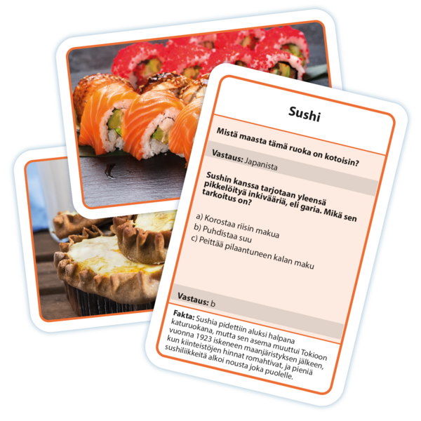 Korttipelikokoinen tietopeli. Erotatko quesadillan hampurilaisesta? Yritä tunnistaa maailman kuuluisimpia ja suosituimpia ruokia ja vastaa niitä koskeviin kysymyksiin. Pelissä ei odotella, sillä kaikki vastaavat kaikkiin kysymyksiin! Sisältää 50 korttia. Valmistettu Suomessa. Ikäsuositus: 12+ v. Pelaajien määrä: 2+. Pelin kesto: 15+ min.