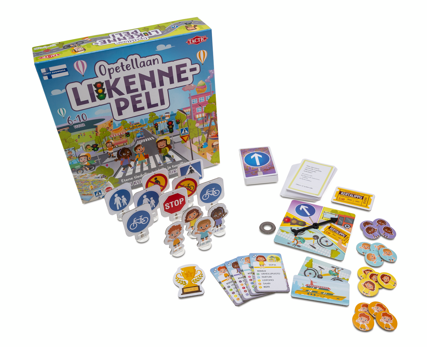 Kuka ehtii ensimmäisenä perille – kuitenkaan töpeksimättä liikenteessä! Kuka pokkaa taitavan tielläliikkujan pokaalin? Kaverukset ovat matkalla koulusta kotiin. He kisaavat, kuka hoitaa matkan varrelle osuvat askareensa nopeimmin ja on ensimmäisenä kotona. Käytä askeleesi viisaasti ja vastaa oikein liikenneaiheisiin kysymyksiin. Siirreltävät liikennemerkit tekevät joka pelikerrasta erilaisen. Nappaa itsellesi taitavan tielläliikkujan pokaali ja saavu ensimmäisenä perille! Tämä tuote on valmistettu Suomen Porissa, Tactic Gamesin omalla vastuullisella tehtaalla. Ostamalla kotimaista tuet samalla kotimaisen työn jatkuvuutta. Opetellaan-tuotteet ovat hauskoja ja opettavaisia. Valikoimaan kuuluu laaja kirjo erilaisia lautapelejä, korttipelejä ja kirjoja. Yhdessä suomalaisten opettajien kanssa kehitetyt Opetellaan-pelimme tuovat yhteen Suomen äärimmäisen korkeatasoisen koulutuksen ja viihdyttävät tuotteet, jotka vahvistavat lapsesi havainnointikykyä sekä fyysisiä ja tunnetaitoja. Opetellaan on oppimista suomalaiseen tapaan - eli pelaamalla!