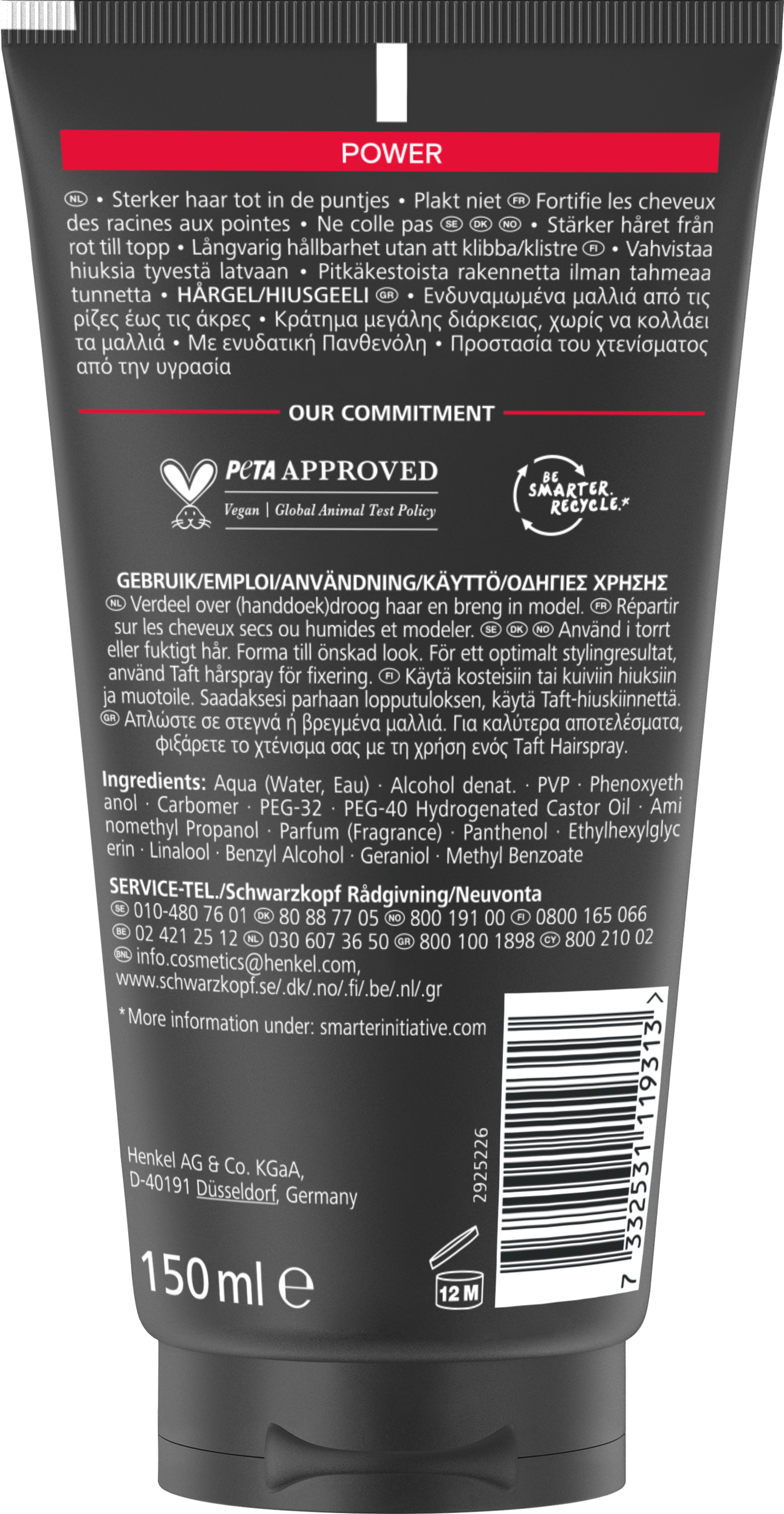 Schwarzkopf Taft Power Styling Gel 150 ml – voimakas pito jopa 48 tunniksi Taft Power Gel -geeli vahvistaa hiuksia tyvestä latvoihin. Vahvan hiusgeelin innovatiivinen koostumus tarjoaa pitkäkestoisen pidon ilman tahmeutta jopa 48 tunnin ajaksi. Geeli on hellävarainen hiuksille ja päänahalle ja sisältää kosteuttavaa pantenolia. Taft-hiusgeeli auttaa suojaamaan kampausta kosteudelta. Taft-muotoilutuotteiden koostumus on vegaaninen* ja niillä on PETA:n hyväksyntä**. Ole fiksumpi. Kierrätä.*** Käyttöohjeet: Levitä kuiviin tai kosteisiin hiuksiin ja muotoile. Parhaan tuloksen saat viimeistelemällä kampauksen Taft-hiuslakalla. Tuotteen hyödyt yhdellä silmäyksellä: Voimakas pito jopa 48 tunniksi Hellävarainen hiuksille ja päänahalle Pidon taso 5 Suojaa kosteudelta Vegaaninen koostumus* PETA:n hyväksyntä** *Ei sisällä eläinperäisiä ainesosia **Maailmanlaajuinen eläinkoekäytäntö ***Lisätietoja: smarterinitiative.com