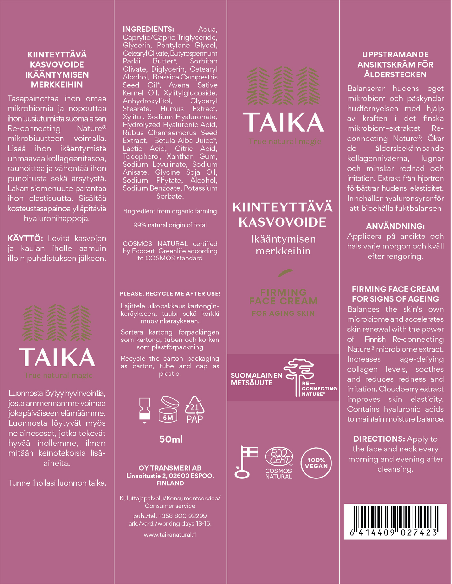 Taika Kiinteyttävä Kasvovoide tasapainottaa ihon mikrobiomia ja edistää sen luonnollista uusiutumista ainutlaatuisen suomalaisen Re-connecting Nature® mikrobiuutteen voimalla. Tämä ravitseva voide vahvistaa ihon suojamuuria, rauhoittaa punoitusta ja vähentää ärsytystä. Lakan siemenuute parantaa ihon elastisuutta, ja hyaluronihappo ylläpitää ihon kosteustasapainoa, jättäen sen kimmoisaksi ja pehmeäksi. Täyteläinen ja tehokas kasvovoide on täydellinen valinta ikääntyvälle iholle. Vegaaninen luonnonkosmetiikkatuote ja Ecocert Cosmos Natural -sertifioitu, joka sopii kaikille ihotyypeille – myös herkälle iholle. Valmistettu Suomessa.