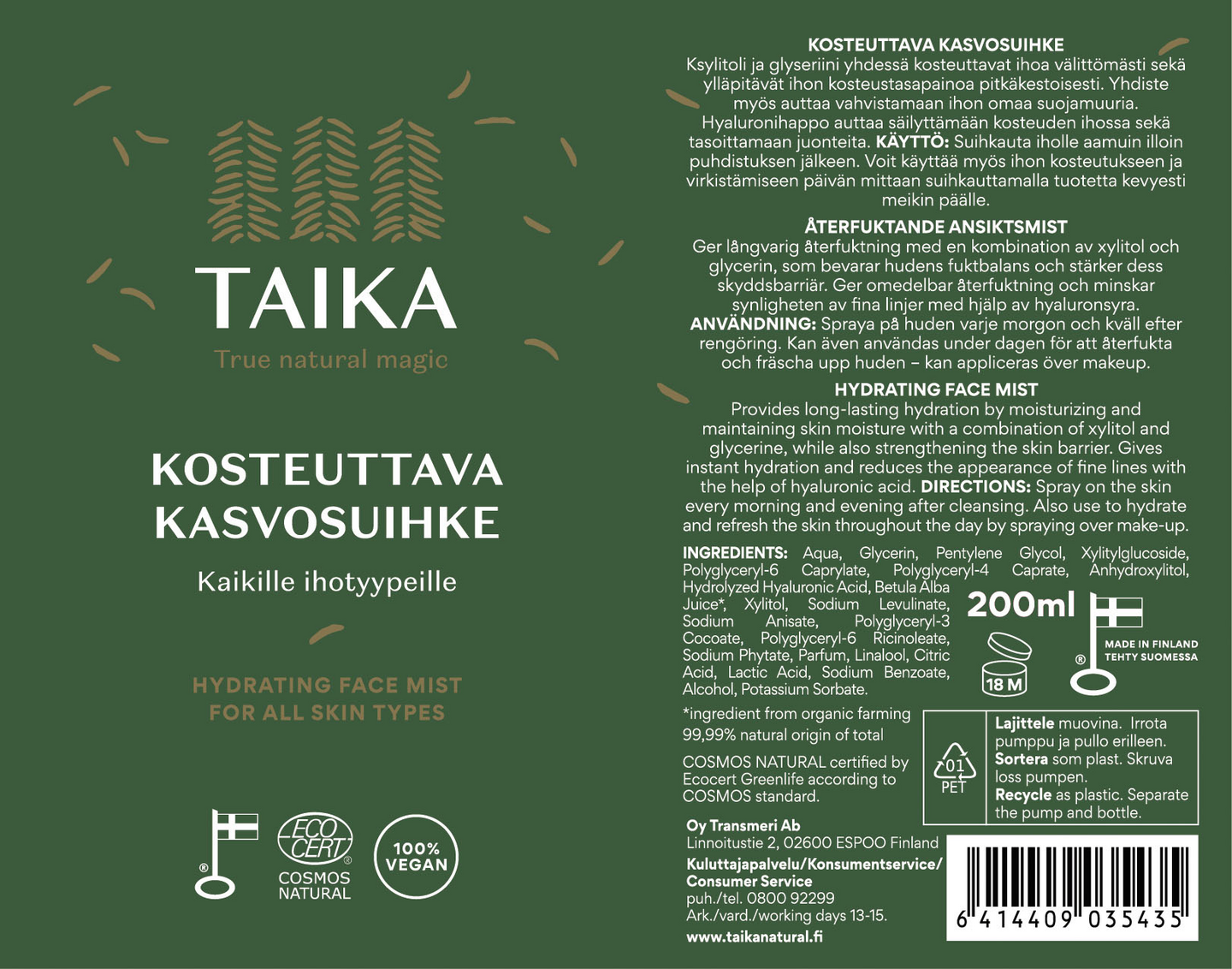 Taika Kosteuttava Kasvosuihke tuo kosteutusta ja raikkautta iholle joka hetkellä. Hyaluronihappo, ksylitoli ja glyseroli kosteuttavat syvältä, kun taas koivunmahla rauhoittaa ja tasapainottaa ihoa. Tämä virkistävä suihke on täydellinen aamun herätykseksi, iltapuhdistukseen tai päivän mittaan meikin päälle! Vegaaninen, Ecocert Cosmos Natural -sertifioitu luonnonkosmetiikkatuote, joka sopii kaikille ihotyypeille. Valmistettu suomessa.