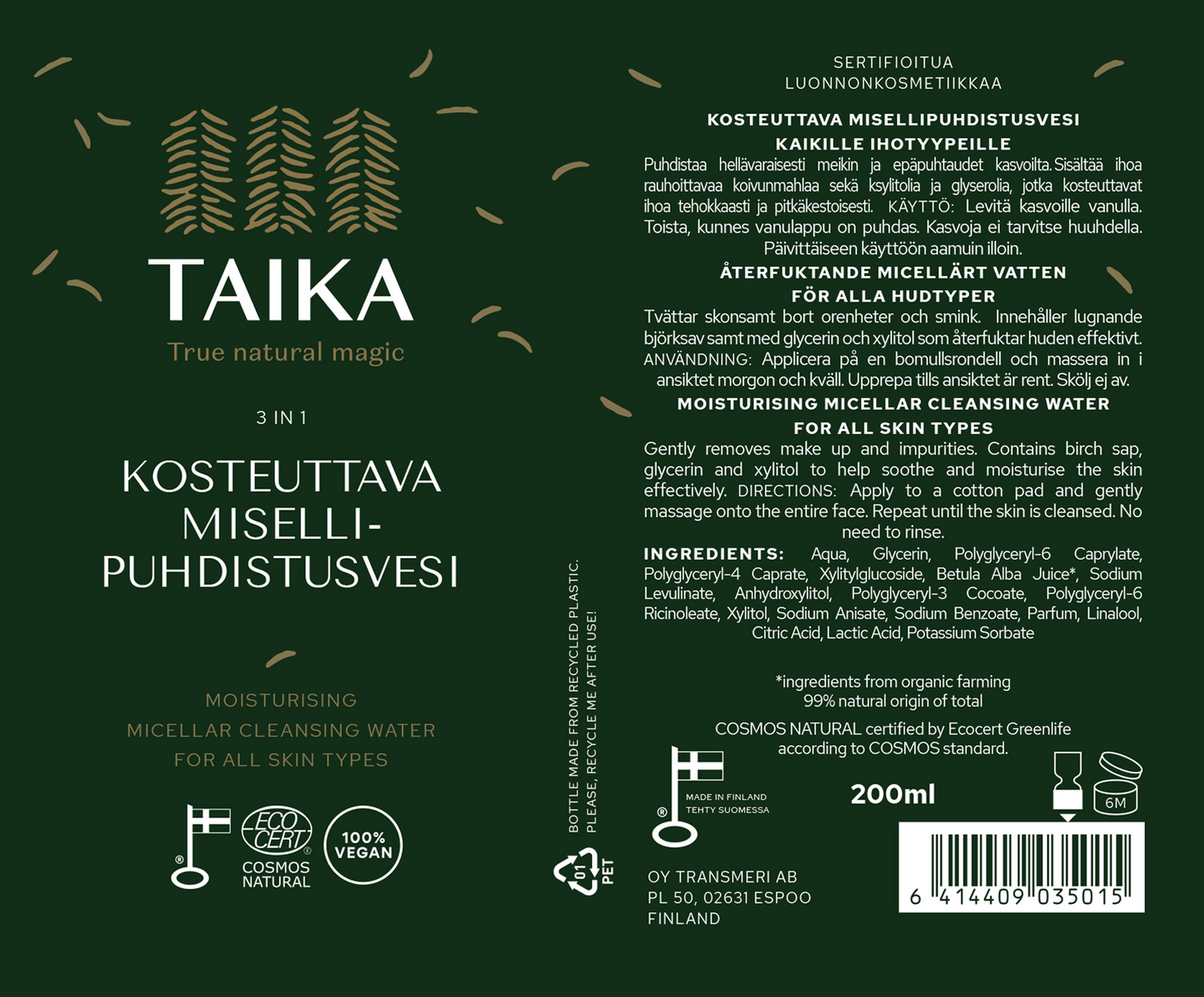 Taika Kosteuttava misellipuhdistusvesi poistaa meikin ja epäpuhtaudet tehokkaasti, mutta hellävaraisesti. Koivunmahla kosteuttaa ja rauhoittaa ihoa, kun taas ksylitoli ja glyseroli auttavat pitämään ihon pehmeänä ja kosteutettuna pitkään ilman kiristävää tunnetta. Puhdistus on nopeaa ja vaivatonta – täydellinen kiireisiin päiviin. Tämä monikäyttöinen misellivesi sopii erinomaisesti myös aamupuhdistukseen, matkalle tai vaikka salikassiin! Vegaaninen, Ecocert Cosmos Natural -sertifioitu luonnonkosmetiikkatuote, joka sopii kaikille ihotyypeille. Valmistettu Suomessa.