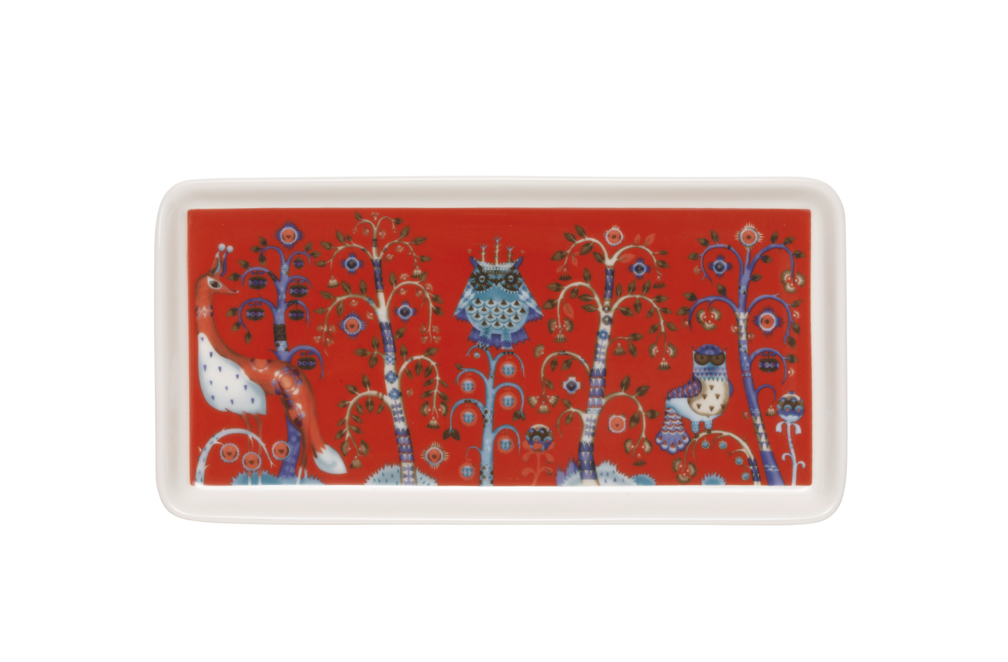 Punainen, suorakaiteen muotoinen 12x24 cm Taika-lautanen sopii tarjoiluun ja on kaunis sisustusesine sellaisenaan. Lautasessa Klaus Haapaniemen kiehtovat kuvitukset yhdistyvät Heikki Orvolan pelkistettyihin muotoihin. Monikäyttöinen lautanen on myös kaunis sisustusesine, pitäen pienet aarteet kauniisti esillä. Loistava lahjaidea.