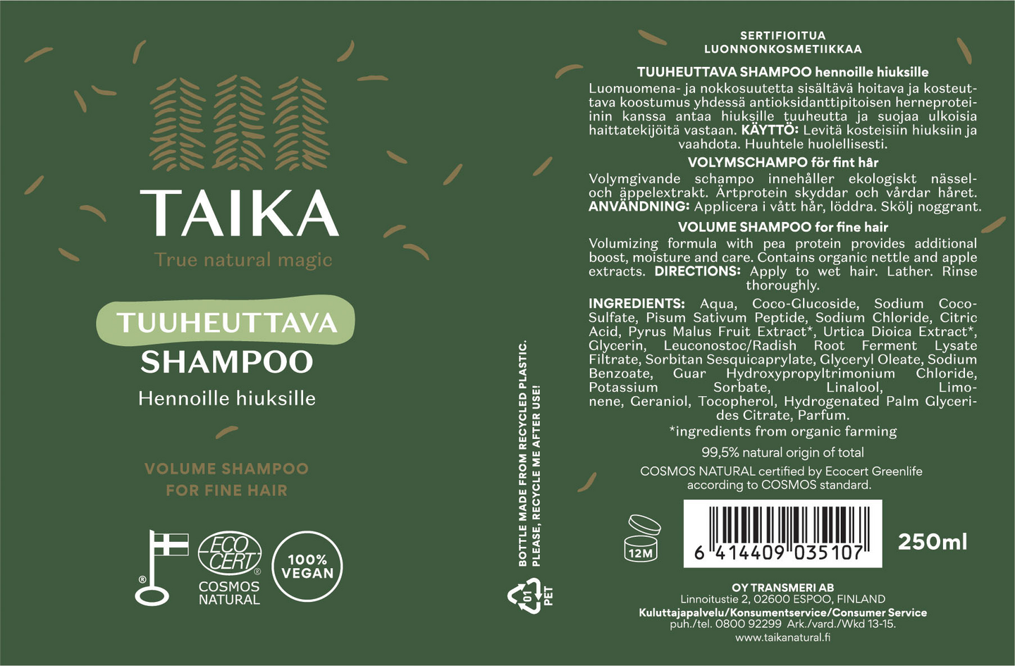 Taika Tuuheuttava shampoo puhdistaa hiukset hellävaraisesti ja lisää samalla kaivattua volyymia ja tuuheutta. Luomunokkos- ja omenauutteet ravitsevat hiuksia, ja kosteuttava betaiini vahvistaa niitä, jättäen hiukset elinvoimaisiksi. Tämä shampoo on täydellinen erityisesti ohuille ja hennoille hiuksille, mutta sopii kaikille hiuslaaduille. Pehmeästi vaahtoava koostumus jättää hiukset ilmaviksi, raikkaiksi ja täyteläisiksi – valmiiksi hoitoaineelle. Tämä vegaaninen shampoo on luonnonkosmetiikkaa parhaimmillaan – sen huolellisesti valitut luonnolliset ainesosat lisäävät hiusten volyymia ja tuuheutta tehokkaasti, samalla kunnioittaen ympäristöä. Ecocert Cosmos Natural -sertifioitu, valmistettu Suomessa.