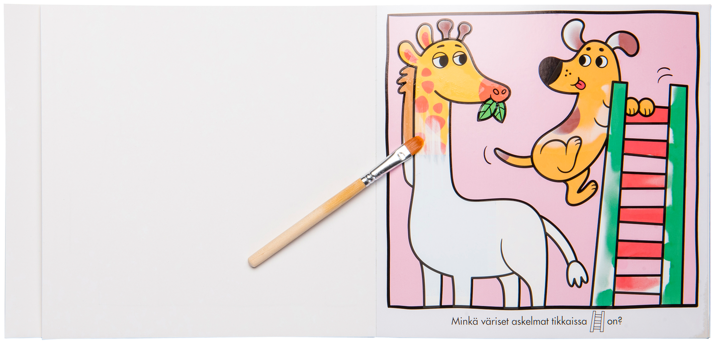 Valloittavaa maalauspuuhaa pienille! Kasta pensseli veteen ja maalaa sillä sivuja. Kauniit värit ja yksityiskohdat ilmestyvät sivuille kuin taiottuina. Tutki paljastunutta kuvaa ja vastaa kysymyksiin. Kuivuttuaan värit häviävät kuvasta ja voit aloittaa leikin taas alusta!